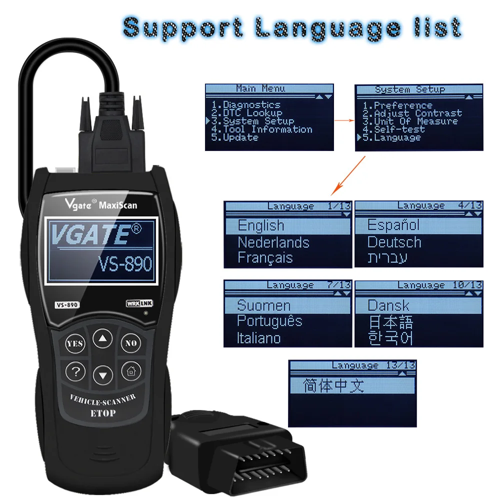 Диагностический сканер OBD2 считыватель кода Vgate VS890, инструмент сканирования двигателя EOBD OBD II, автомобильный диагностический сканер CAN-BUS, сканер неисправностей автомобиля