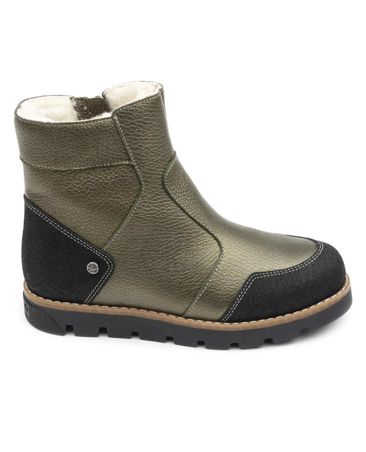 Классические лаконичные утепленные ботинки на подкладке из шерстяного меха. Выполнены из гладкой кожи цвета Хаки с металлическим отливом. Украшены металлическим логотипом. Застежка-молния сбоку для удобства надевания. Упругая анатомическая стелька для правильного формирования стопы. Жесткий фиксирующий задник с удлиненным крылом надежно стабилизирует голеностопный сустав во время ходьбы. Упругая, умеренно-эластичная подошва с протектором, имеющая перекат, позволяющий повторить естественное движение стопы при ходьбе для правильного распределения нагрузки на опорно-двигательный аппарат ребенка. Подкладка из шерстяного меха поддерживает комфортную температуру внутри обуви при погодных условиях от -5 до -15 градусов.