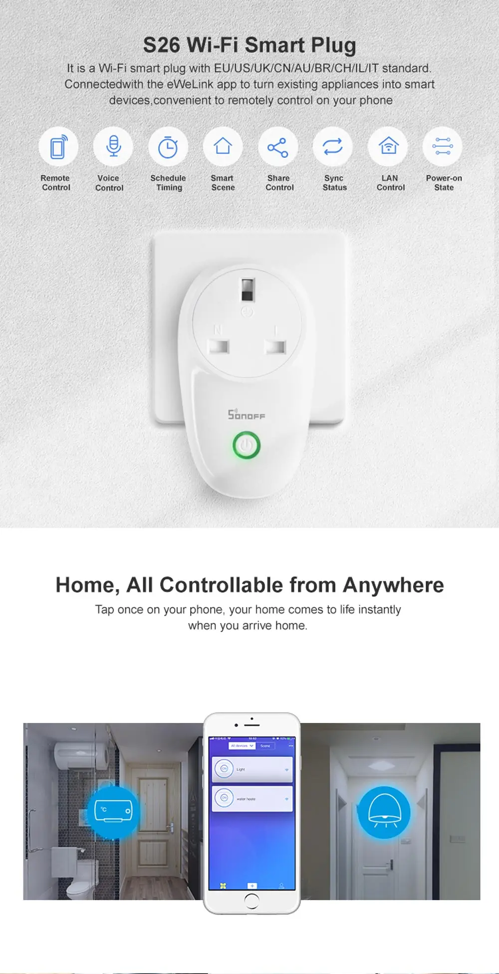 Умная розетка Itead SONOFF S26, Wi-Fi, EU-E/EU-F/UK/AU/US/BR/IT/IL/CH/CN, таймер, настенная розетка, e-WeLink, вилки, работают с Alexa