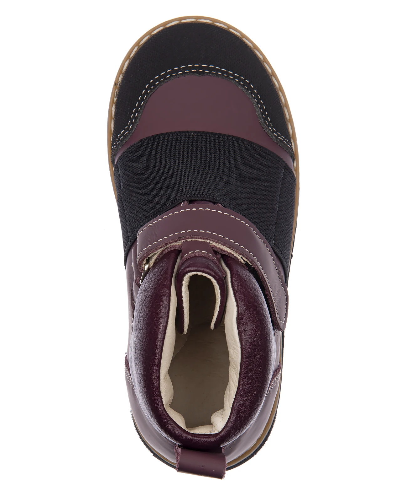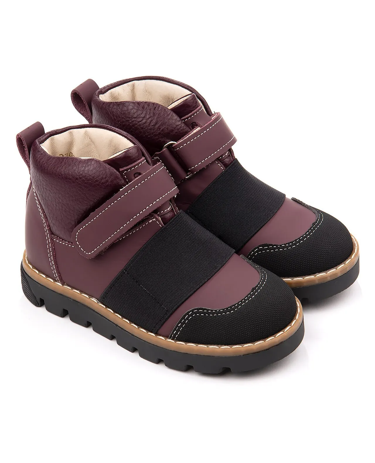 Ботинки на кожаной подкладке. Выполнены из гладкой и гидрофобной кожи актуального бордового цвета, с защитным покрытием на носу. Модный, востребованный дизайн с широкой резинкой. Многослойная, анатомическая стелька для правильного формирования стопы. Жесткий фиксирующий задник с удлиненным крылом надежно стабилизирует голеностопный сустав во время ходьбы. Упругая, умеренно-эластичная подошва с протектором, имеющая перекат, позволяющий повторить естественное движение стопы при ходьбе для правильного распределения нагрузки на опорно-двигательный аппарат ребенка. Подкладка из натуральной кожи поддерживает комфортную температуру внутри обуви при погодных условиях от +10 до 0 градусов. Застежки типа «велкро» позволяют оптимально подогнать полноту обуви по ноге ребенка.