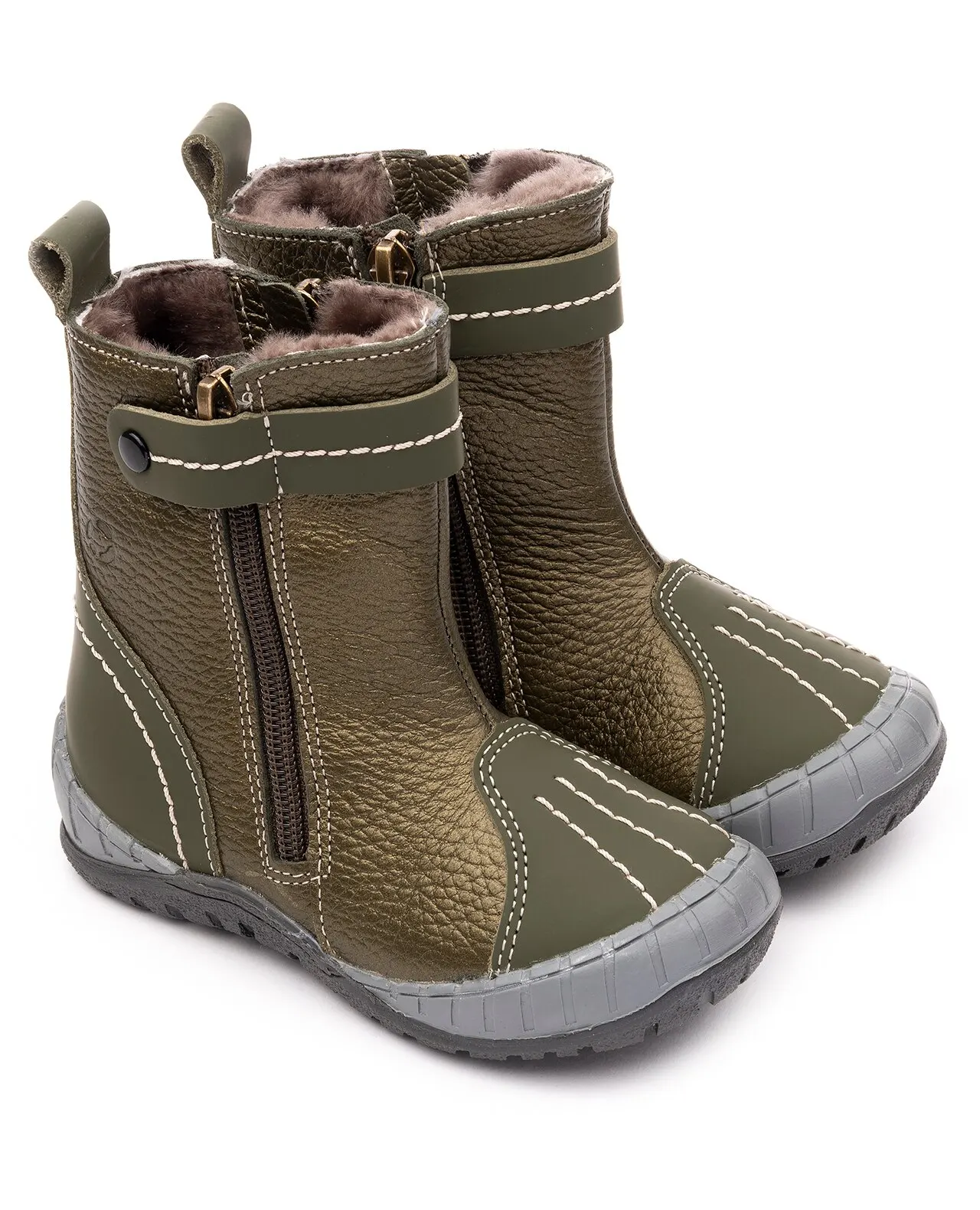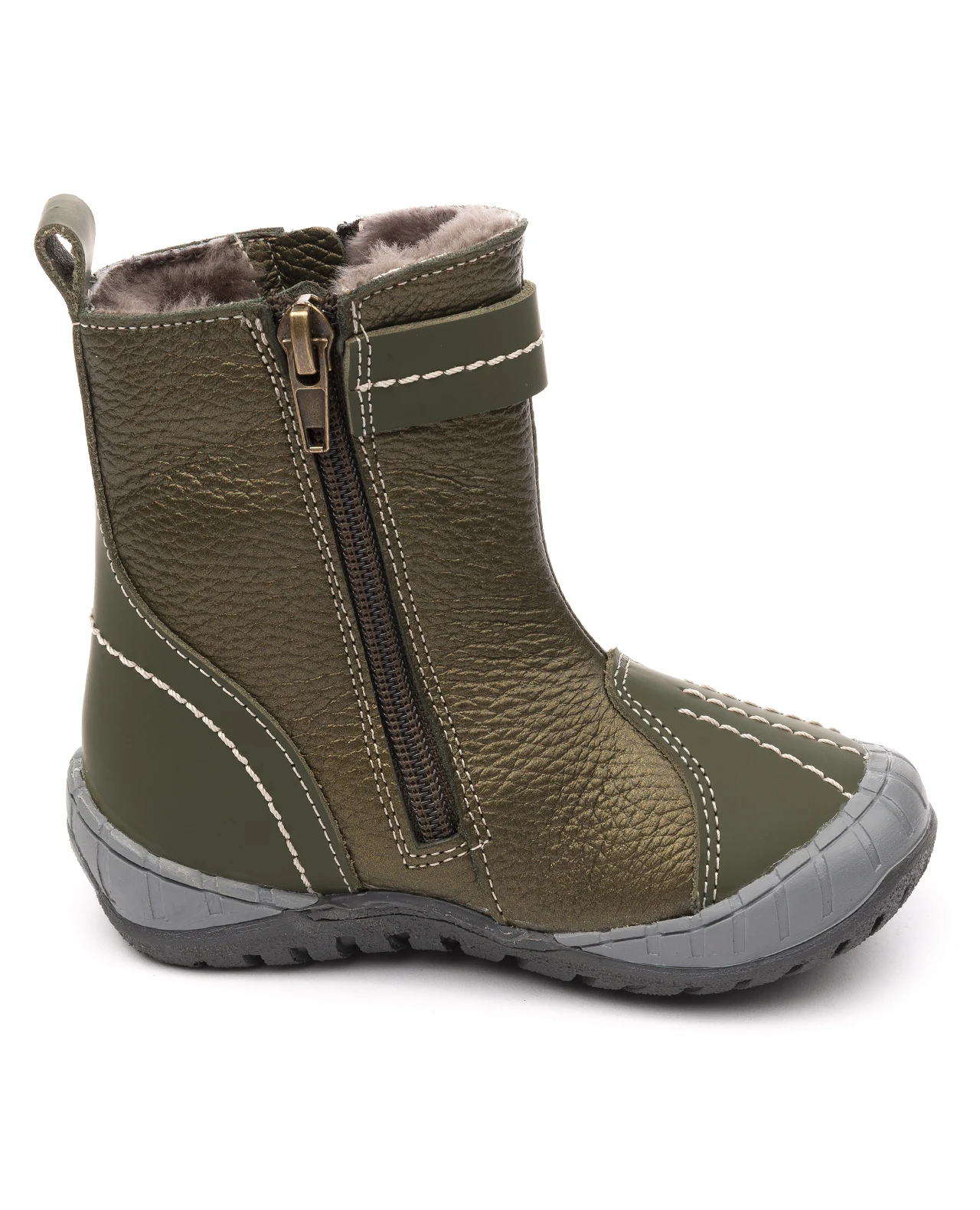 Сапожки утепленные, на подкладке из натурального меха, для самых маленьких. Выполнены из гладкой кожи модного цвета Хаки с металлическим отливом, носок и пятка - из кожи с гидрофобным покрытием. Застежки-молния с двух сторон обеспечивают максимальное раскрытие и комфорт при надевании. Многослойная, анатомическая стелька для правильного формирования стопы. Упругая, умеренно-эластичная подошва, имеющая перекат, позволяющий повторить естественное движение стопы при ходьбе для правильного распределения нагрузки на опорно-двигательный аппарат ребенка. Подошва закрывает часть носка и пятки, что дополнительно защищает модель от промокания в сырую погоду. Подкладка из натурального меха поддерживает комфортную температуру внутри обуви при погодных условиях от - 10 до -25 градусов. Сапожки украшены контрастной строчкой и милыми кнопочками по бокам.