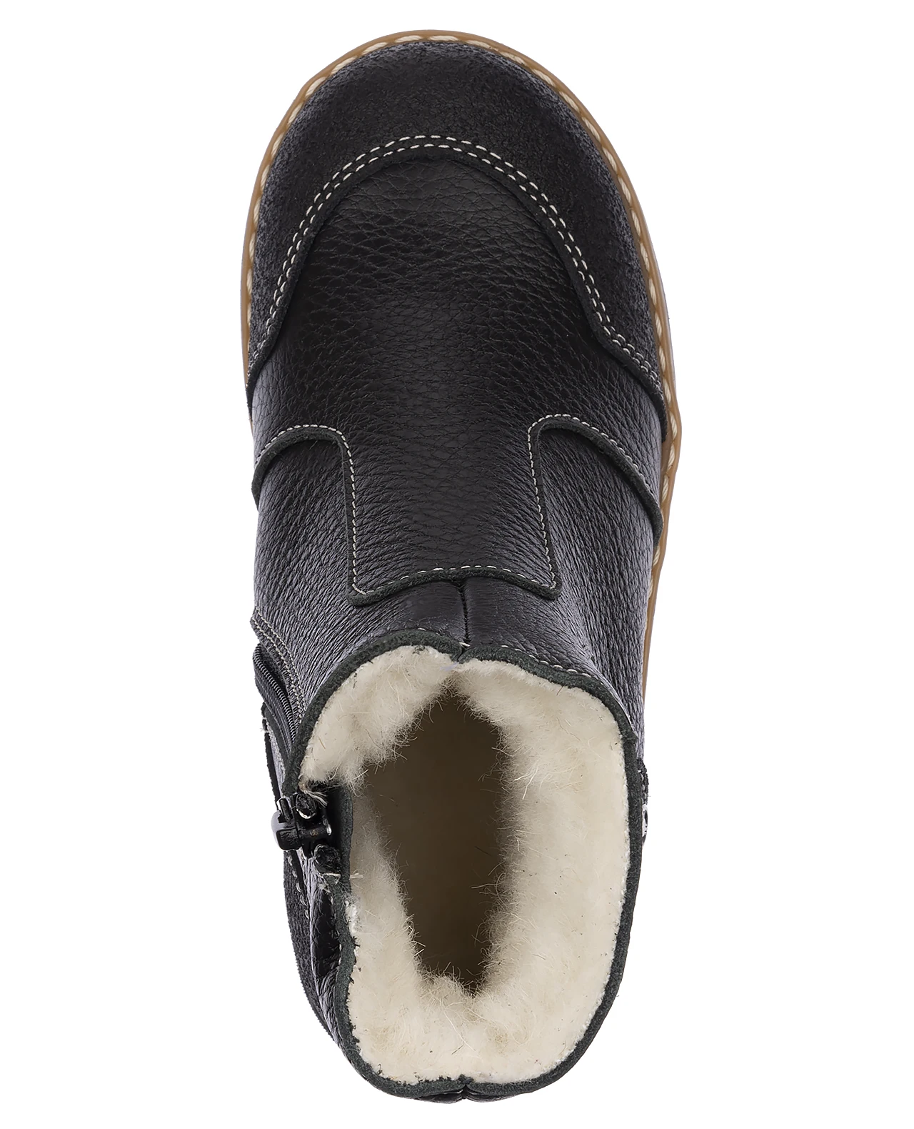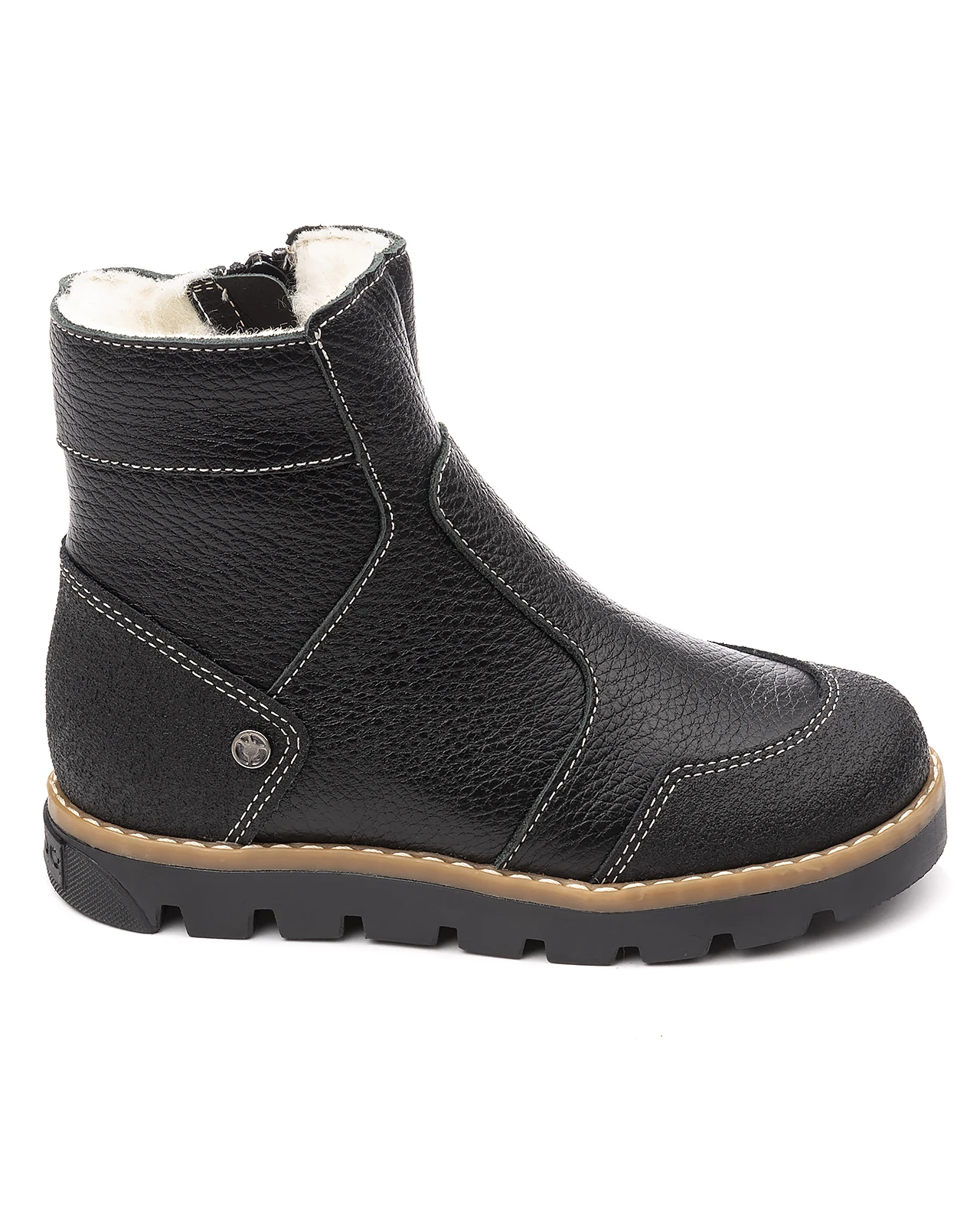 Классические лаконичные утепленные ботинки на подкладке из шерстяного меха. Выполнены из гладкой кожи универсального черного цвета, защитное покрытие на носке и пятке. Украшены металлическим логотипом. Застежка-молния сбоку для удобства надевания. Упругая анатомическая стелька для правильного формирования стопы. Жесткий фиксирующий задник с удлиненным крылом надежно стабилизирует голеностопный сустав во время ходьбы. Упругая, умеренно-эластичная подошва с протектором, имеющая перекат, позволяющий повторить естественное движение стопы при ходьбе для правильного распределения нагрузки на опорно-двигательный аппарат ребенка. Подкладка из шерстяного меха поддерживает комфортную температуру внутри обуви при погодных условиях от -5 до -15 градусов.