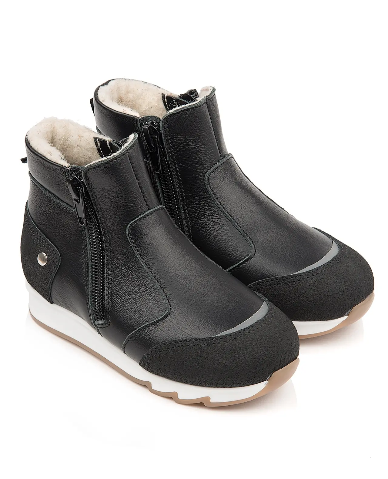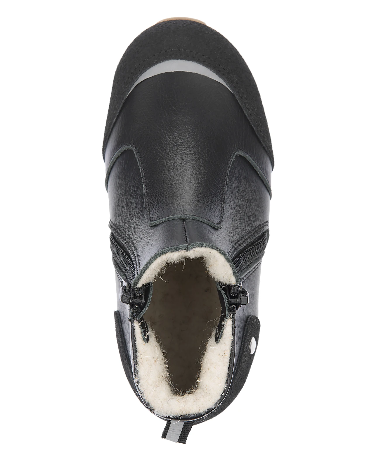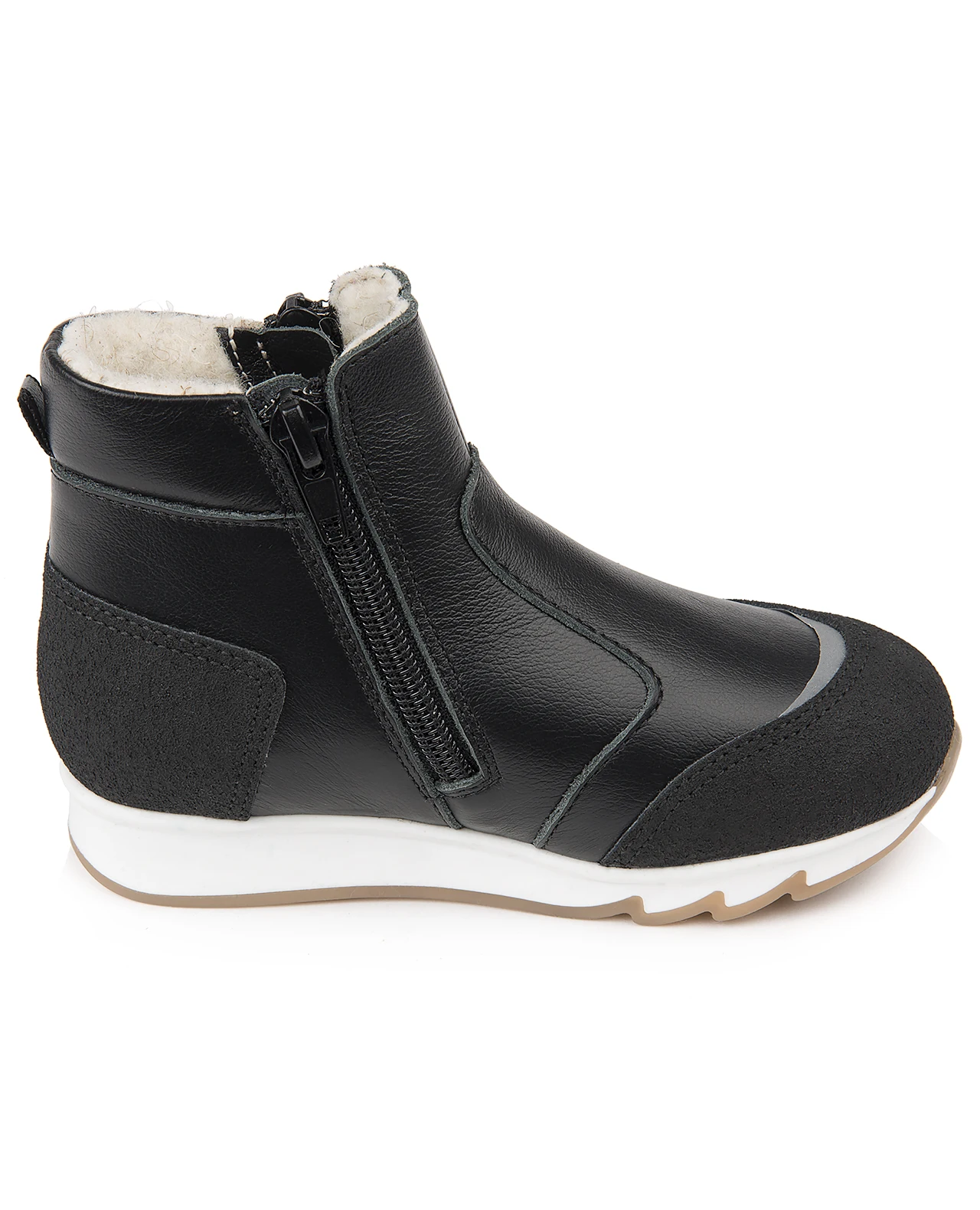 Модные утепленные ботинки в спортивном стиле на подкладке из шерстяной байки. Выполнены из гладкой черной кожи с защитным покрытием на носке и пятке, подойдёт и мальчикам, и девочкам. Украшены логотипом и светоотражающей тесьмой. Модель на двух молниях для удобства надевания и максимального раскрытия. Упругая анатомическая стелька для правильного формирования стопы. Жесткий фиксирующий задник с удлиненным крылом надежно стабилизирует голеностопный сустав во время ходьбы. Упругая, умеренно-эластичная подошва с протектором, имеющая перекат, позволяющий повторить естественное движение стопы при ходьбе для правильного распределения нагрузки на опорно-двигательный аппарат ребенка. Подкладка из шерстяной байки поддерживает комфортную температуру внутри обуви при погодных условиях от +5 до -7 градусов.