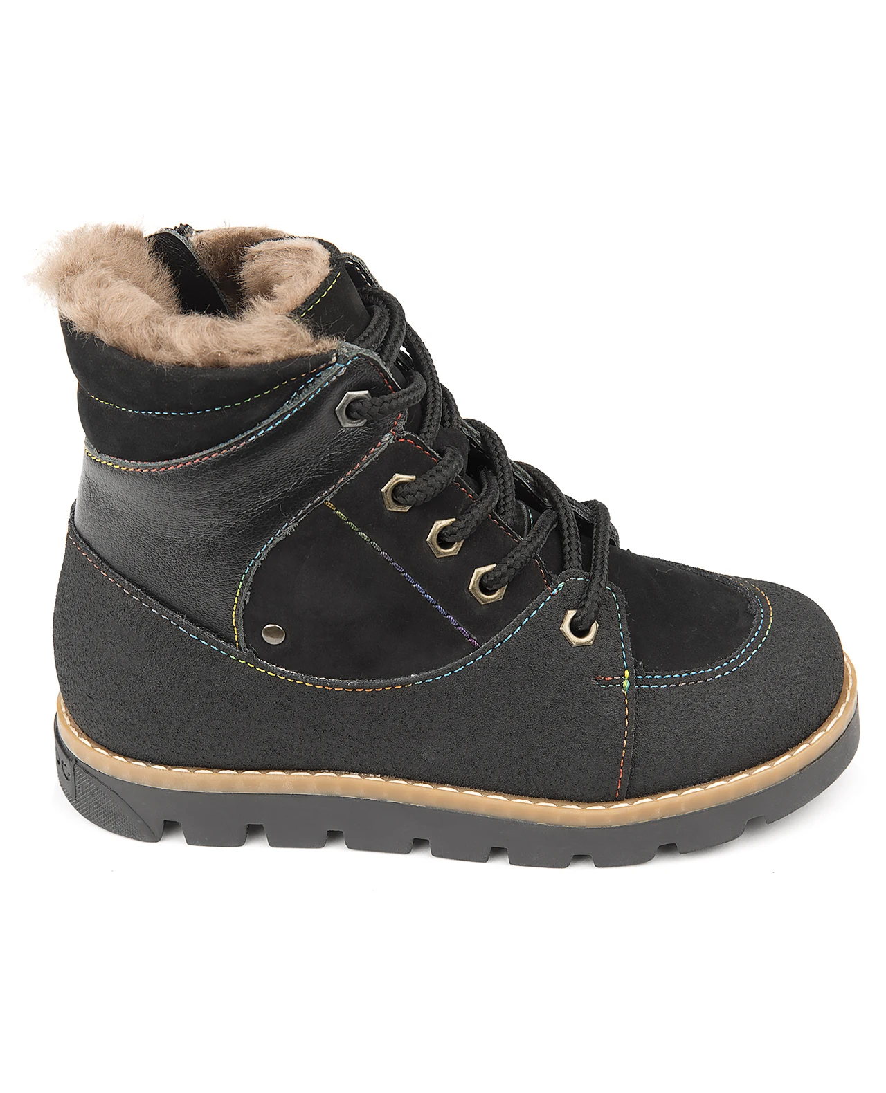 Современные высокие утепленные ботинки на подкладке из натурального меха. Выполнены из натурального нубука универсального чёрного цвета, украшены контрастной строчкой. Защитное покрытие по всему низу изделия. Удобная застежка-молния сбоку, дополнительная шнуровка спереди, позволяющая оптимально подогнать полноту обуви по ноге ребенка. Широкий, комфортный мягкий кант. Упругая анатомическая стелька для правильного формирования стопы. Жесткий фиксирующий задник с удлиненным крылом надежно стабилизирует голеностопный сустав во время ходьбы. Упругая, умеренно-эластичная подошва с протектором, имеющая перекат, позволяющий повторить естественное движение стопы при ходьбе для правильного распределения нагрузки на опорно-двигательный аппарат ребенка. Подкладка из натурального меха поддерживает комфортную температуру внутри обуви при погодных условиях от -10 до -25 градусов.