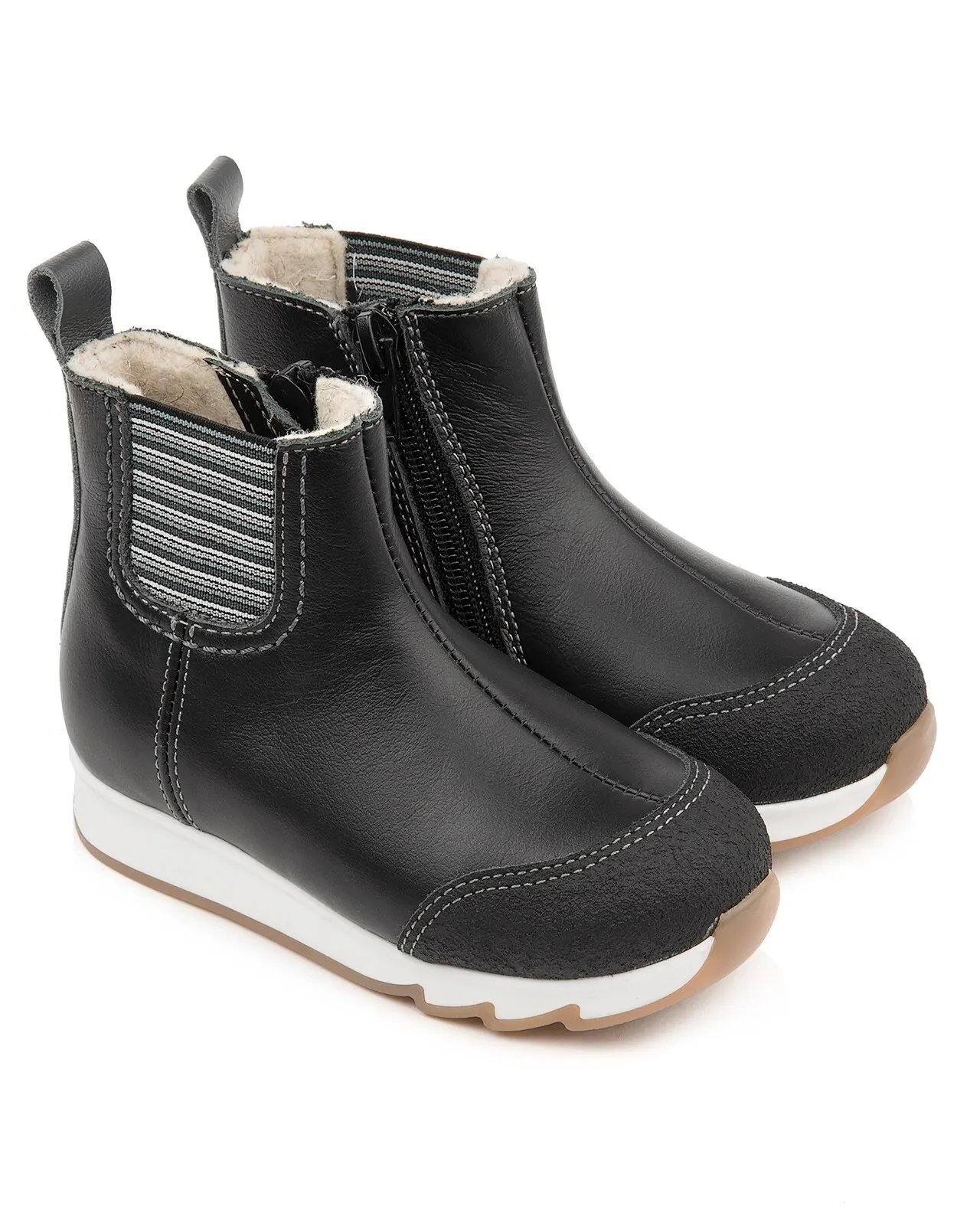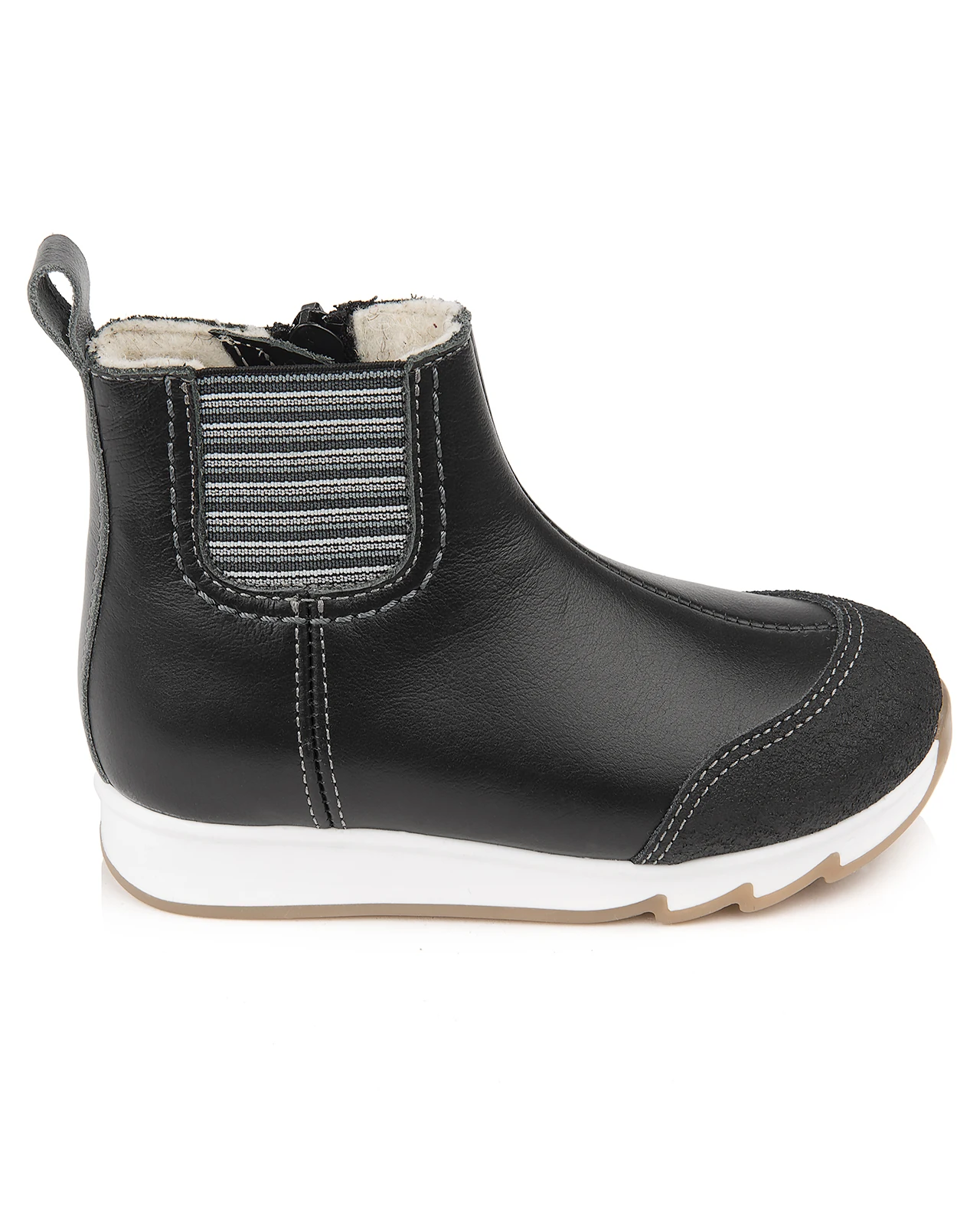 Модные ботинки для девочки с элементами обуви-Челси на подкладке из шерстяной байки. Выполнены из гладкой черной кожи с защитным покрытием на носу. Модель украшена контрастными резинками с двух сторон. Застержка на молнию для удобства надевания. Упругая анатомическая стелька для правильного формирования стопы. Жесткий фиксирующий задник с удлиненным крылом надежно стабилизирует голеностопный сустав во время ходьбы. Упругая, умеренно-эластичная подошва с протектором, имеющая перекат, позволяющий повторить естественное движение стопы при ходьбе для правильного распределения нагрузки на опорно-двигательный аппарат ребенка. Подкладка из шерстяной байки поддерживает комфортную температуру внутри обуви при погодных условиях от +5 до -7 градусов.