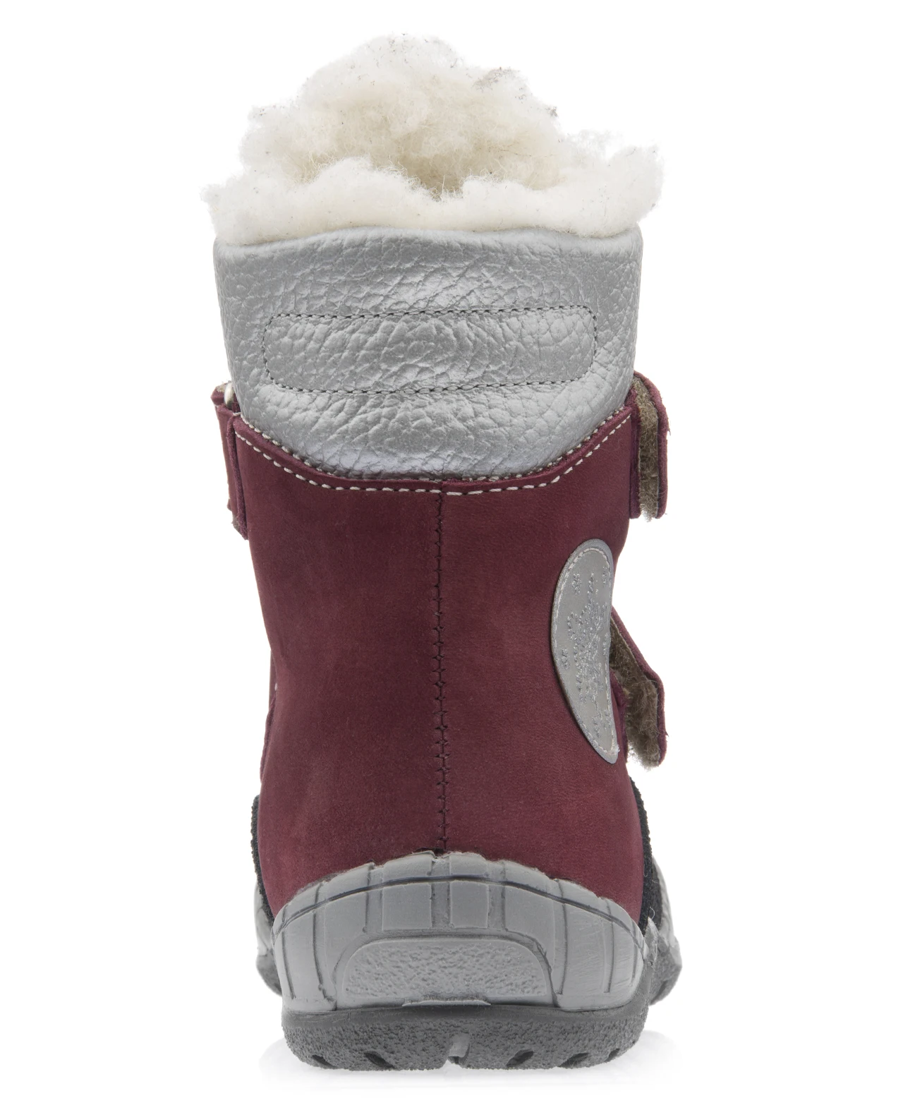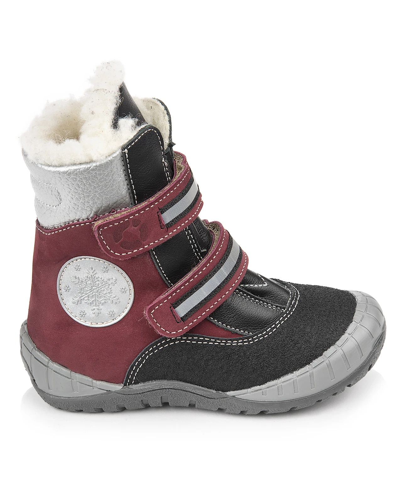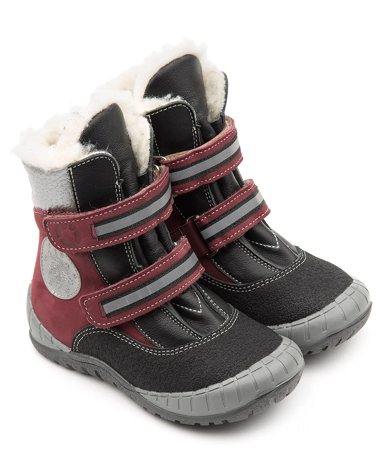 Ботиночки утепленные, на подкладке из шерстяного меха, для самых маленьких. Выполнены из натуральной черной кожи и натурального нубука насыщенного бордового цвета, носок усилен анти-вандальным покрытием. Два ремешка с застежкой типа велкро позволяют отрегулировать модель по полноте, дополнены светоотражающей тесьмой. Высокий комфортный мягкий кант. Многослойная, анатомическая стелька для правильного формирования стопы. Упругая, умеренно-эластичная подошва, имеющая перекат, позволяющий повторить естественное движение стопы при ходьбе для правильного распределения нагрузки на опорно-двигательный аппарат ребенка. Подошва закрывает часть носка и пятки, что дополнительно защищает модель от промокания в сырую погоду. Подкладка из шерстяного меха поддерживает комфортную температуру внутри обуви при погодных условиях от - 5 до -15 градусов. Украшение в виде снежинки по бокам выполнено из светоотражающего материала.