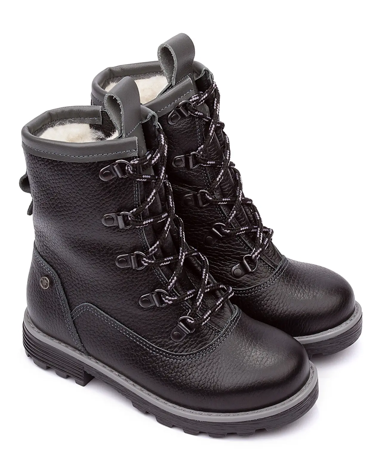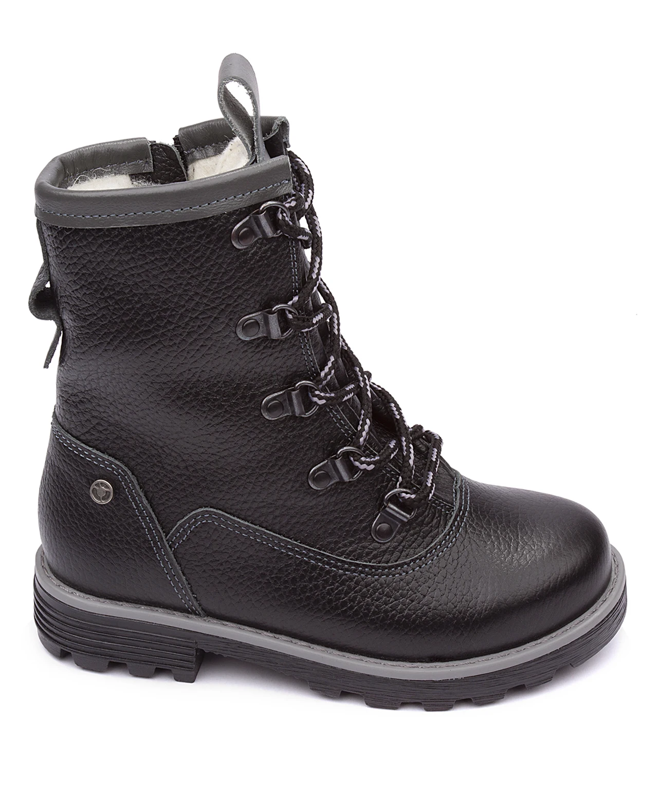 Ботинки утепленные, на подкладке из шерстяного меха. Актуальный дизайн для активных детей. Жесткий задник, многослойная анатомическая стелька. Подошва с протектором и перекатом в носочной части, позволяющая повторить естественное движение стопы во время ходьбы. Удобная застежка на молнию сбоку. Клапан и шнуровка спереди для регулирования по полноте. Специальная петелька сзади позволяет также завязать шнурки в обхват голени. Украшены металлическим логотипом.