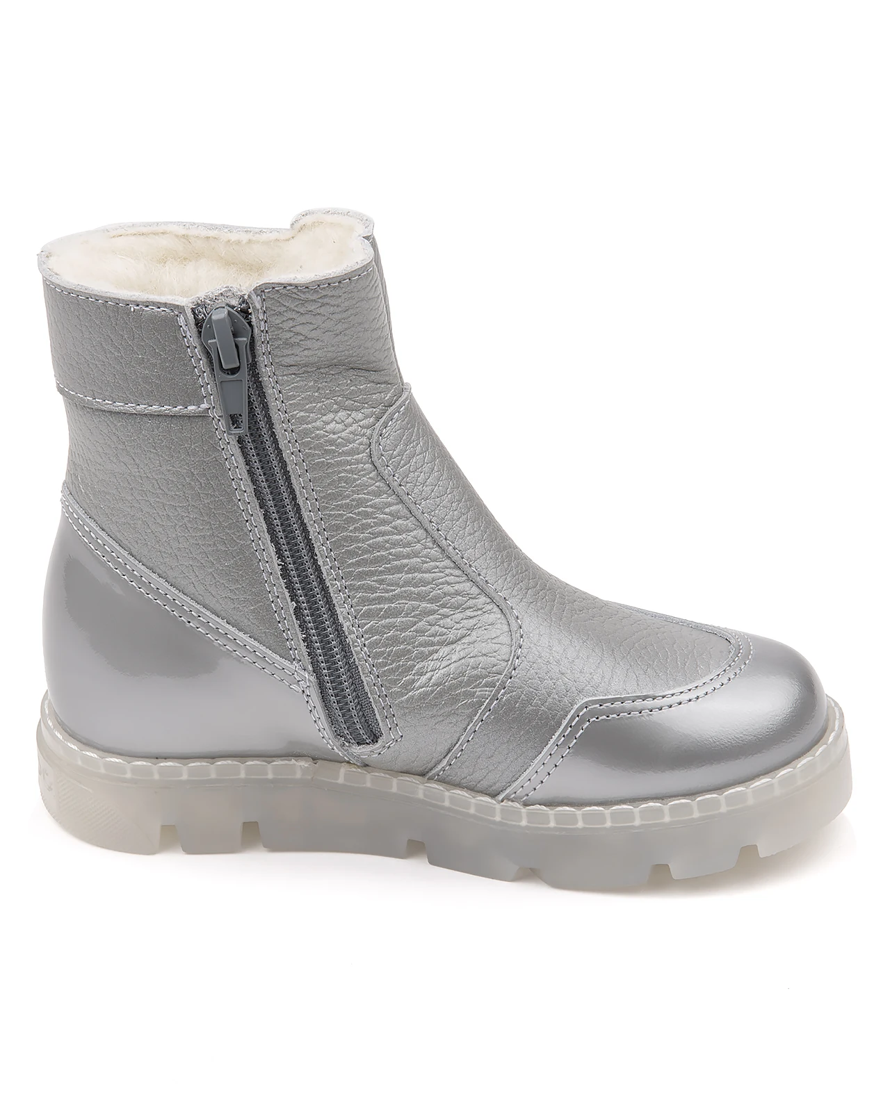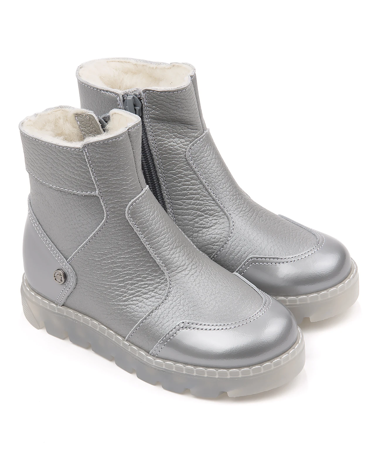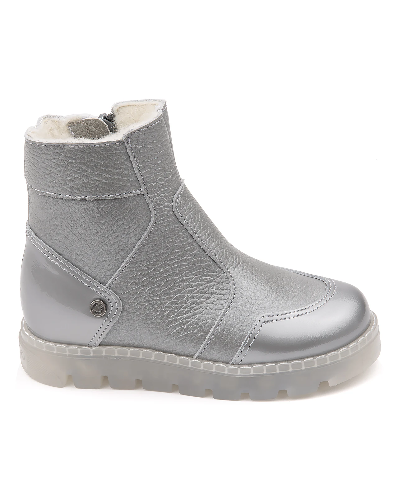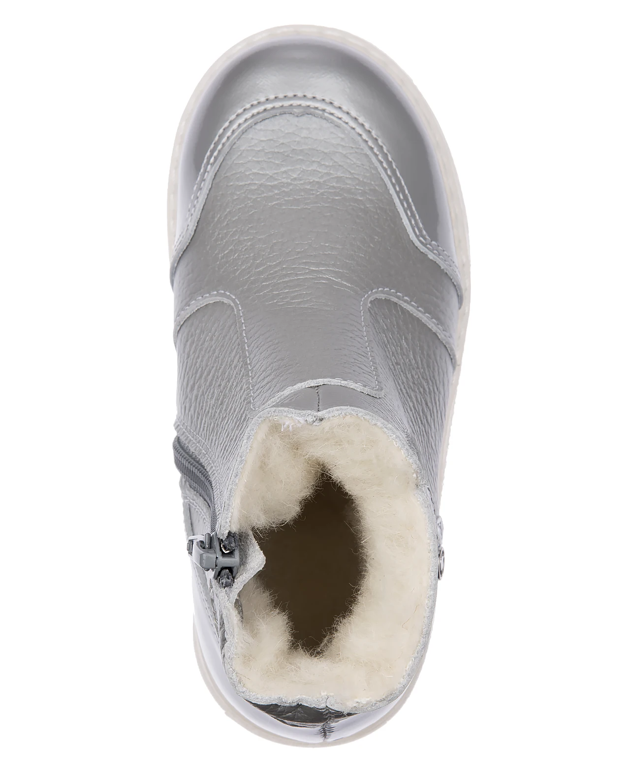 Классические лаконичные утепленные ботинки на подкладке из шерстяного меха. Выполнены из гладкой кожи модного цвета серебристый металлик. Лаковая кожа на носке и пятке. Украшены металлическим логотипом. Застежка-молния сбоку для удобства надевания. Упругая анатомическая стелька для правильного формирования стопы. Жесткий фиксирующий задник с удлиненным крылом надежно стабилизирует голеностопный сустав во время ходьбы. Упругая, умеренно-эластичная подошва с протектором, имеющая перекат, позволяющий повторить естественное движение стопы при ходьбе для правильного распределения нагрузки на опорно-двигательный аппарат ребенка. Подкладка из шерстяного меха поддерживает комфортную температуру внутри обуви при погодных условиях от -5 до -15 градусов.
