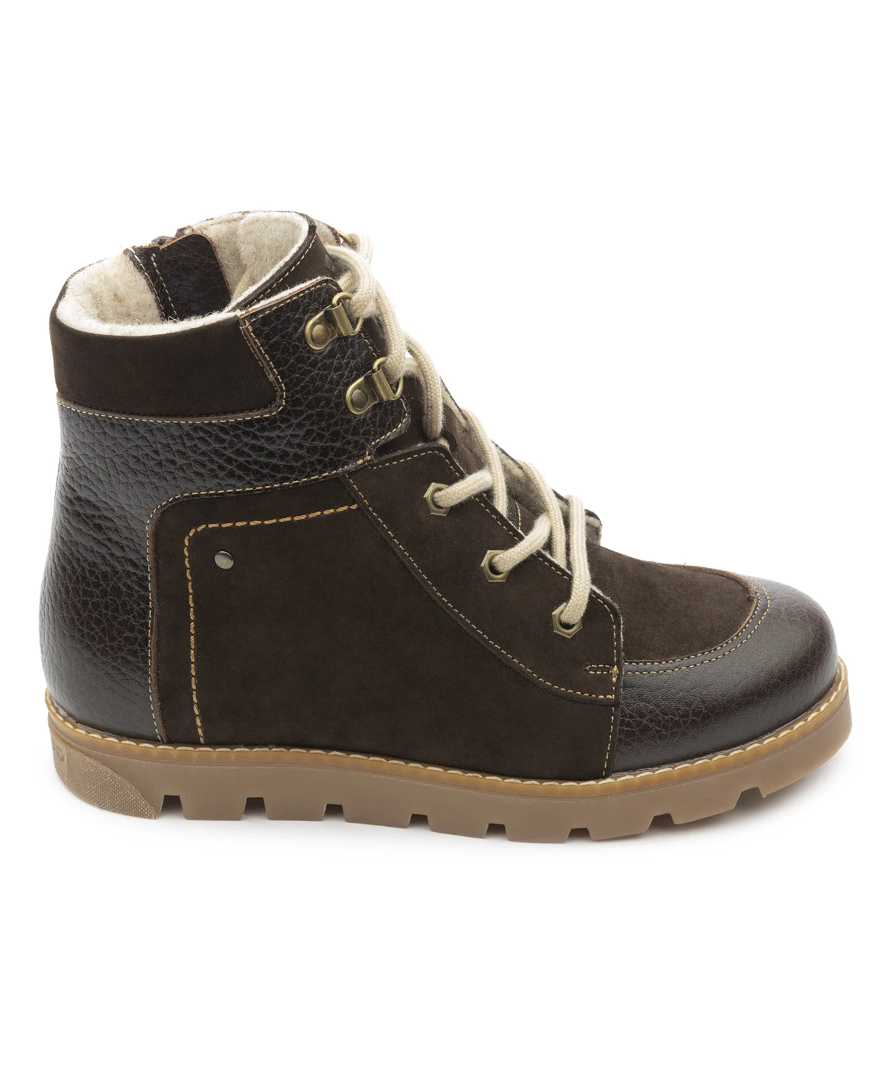 Современные высокие утепленные ботинки на подкладке из шерстяного меха. Выполнены из натурального нубука благородного коричневого цвета. Натуральная гладкая кожа на носке и пятке. Удобная застежка-молния сбоку, дополнительная шнуровка спереди, позволяющая оптимально подогнать полноту обуви по ноге ребенка. Широкий, комфортный мягкий кант. Упругая анатомическая стелька для правильного формирования стопы. Жесткий фиксирующий задник с удлиненным крылом надежно стабилизирует голеностопный сустав во время ходьбы. Упругая, умеренно-эластичная подошва с протектором, имеющая перекат, позволяющий повторить естественное движение стопы при ходьбе для правильного распределения нагрузки на опорно-двигательный аппарат ребенка. Подкладка из шерстяного меха поддерживает комфортную температуру внутри обуви при погодных условиях от -5 до -15 градусов.