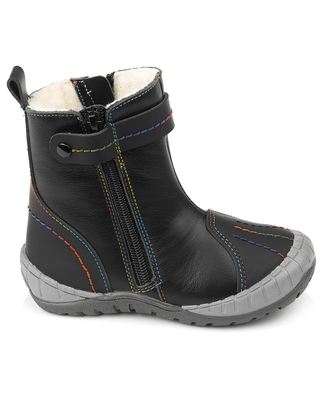 Сапожки утепленные, на подкладке из шерстяного меха, для самых маленьких. Выполнены из гладкой кожи универсального чёрного цвета, носок и пятка - из кожи с гидрофобным покрытием. Застежки-молния с двух сторон обеспечивают максимальное раскрытие и комфорт при надевании. Многослойная, анатомическая стелька для правильного формирования стопы. Упругая, умеренно-эластичная подошва, имеющая перекат, позволяющий повторить естественное движение стопы при ходьбе для правильного распределения нагрузки на опорно-двигательный аппарат ребенка. Подошва закрывает часть носка и пятки, что дополнительно защищает модель от промокания в сырую погоду. Подкладка из шерстяного меха поддерживает комфортную температуру внутри обуви при погодных условиях от - 5 до -15 градусов. Сапожки украшены контрастной строчкой и милыми кнопочками по бокам.