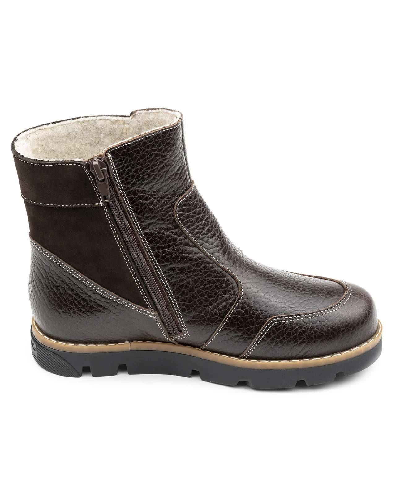 Классические лаконичные утепленные ботинки на подкладке из шерстяной байки. Выполнены из нубука и гладкой кожи благородного коричневого цвета. Украшены металлическим логотипом. Застежка-молния сбоку для удобства надевания. Упругая анатомическая стелька для правильного формирования стопы. Жесткий фиксирующий задник с удлиненным крылом надежно стабилизирует голеностопный сустав во время ходьбы. Упругая, умеренно-эластичная подошва с протектором, имеющая перекат, позволяющий повторить естественное движение стопы при ходьбе для правильного распределения нагрузки на опорно-двигательный аппарат ребенка. Подкладка из шерстяной байки поддерживает комфортную температуру внутри обуви при погодных условиях от +5 до -7 градусов.
