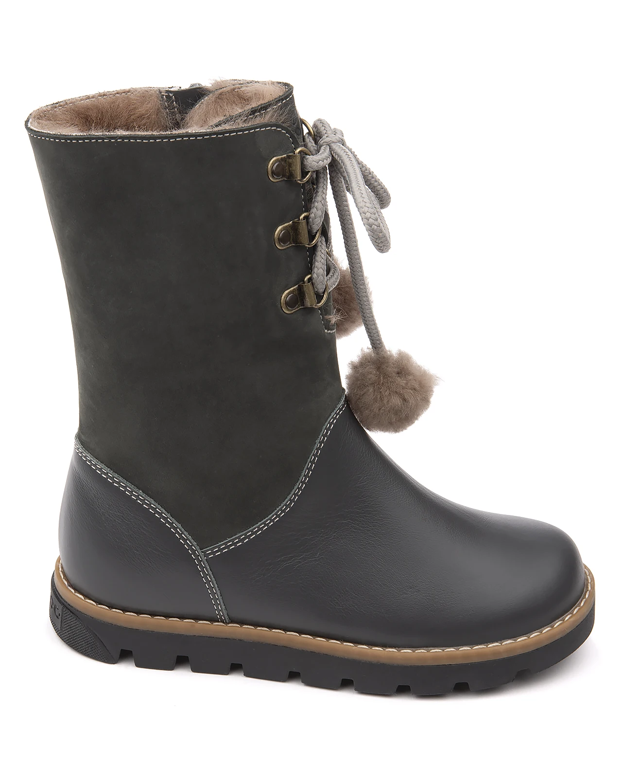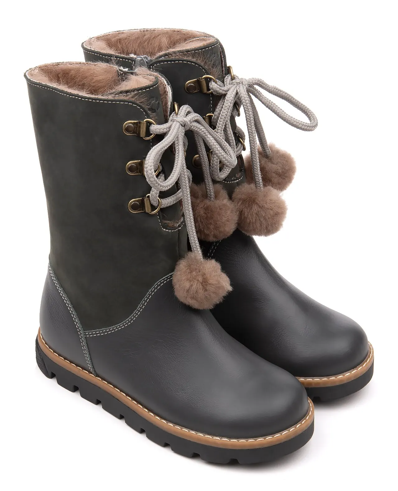 Нарядные сапожки для девочки на подкладке из натурального меха (овчина). Меховые помпоны выполнены на отдельном шнурке, который можно снять или привязать обратно в зависимости от верхней одежды ребенка. Многослойная, анатомическая стелька для правильного формирования стопы. Жесткий фиксирующий задник из термопласта надежно стабилизирует голеностопный сустав во время ходьбы. Упругая, умеренно-эластичная подошва с протектором, имеющая перекат, позволяющий повторить естественное движение стопы при ходьбе для правильного распределения нагрузки на опорно-двигательный аппарат ребенка. Подкладка из натурального меха поддерживает комфортную температуру внутри обуви при погодных условиях от -10 до -25 градусов. Застежка-молния сбоку позволяет легко надевать обувь.