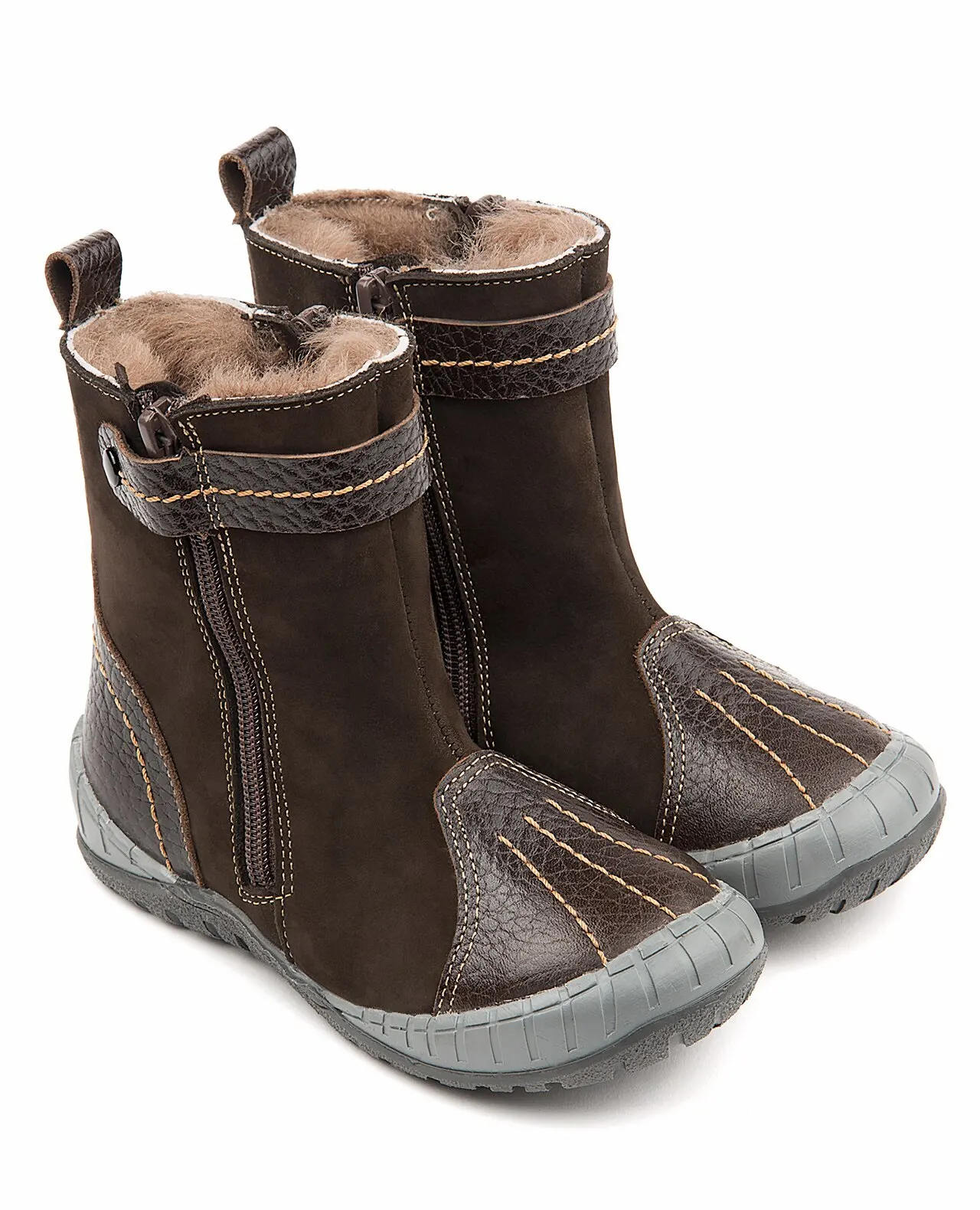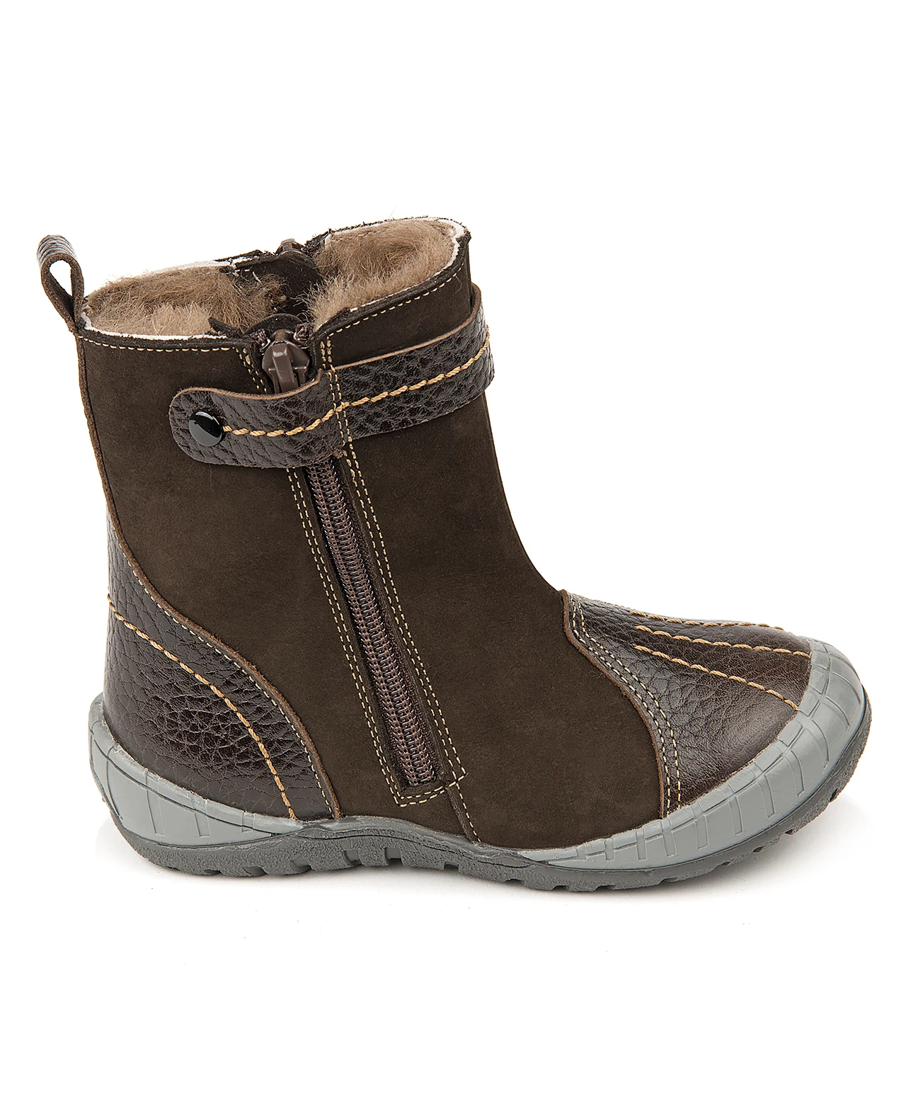 Сапожки утепленные, на подкладке из натурального меха, для самых маленьких. Выполнены из натурального нубука благородного коричневого цвета, носок и пятка - из натуральной гладкой кожи в тон. Застежки-молния с двух сторон обеспечивают максимальное раскрытие и комфорт при надевании. Многослойная, анатомическая стелька для правильного формирования стопы. Упругая, умеренно-эластичная подошва, имеющая перекат, позволяющий повторить естественное движение стопы при ходьбе для правильного распределения нагрузки на опорно-двигательный аппарат ребенка. Подошва закрывает часть носка и пятки, что дополнительно защищает модель от промокания в сырую погоду. Подкладка из натурального меха поддерживает комфортную температуру внутри обуви при погодных условиях от - 10 до -25 градусов. Сапожки украшены контрастной строчкой и милыми кнопочками по бокам.