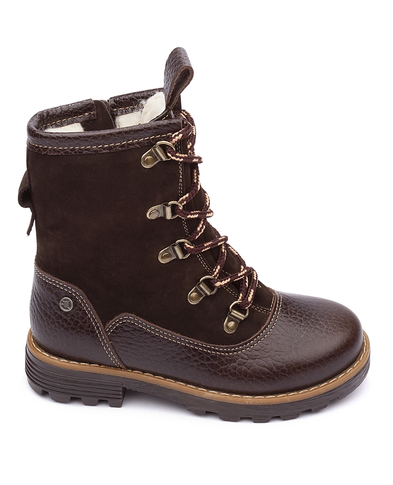 Ботинки утепленные, на подкладке из шерстяного меха. Актуальный дизайн для активных детей. Жесткий задник, многослойная анатомическая стелька. Подошва с протектором и перекатом в носочной части, позволяющая повторить естественное движение стопы во время ходьбы. Удобная застежка на молнию сбоку. Клапан и шнуровка спереди для регулирования по полноте. Специальная петелька сзади позволяет также завязать шнурки в обхват голени. Украшены металлическим логотипом.