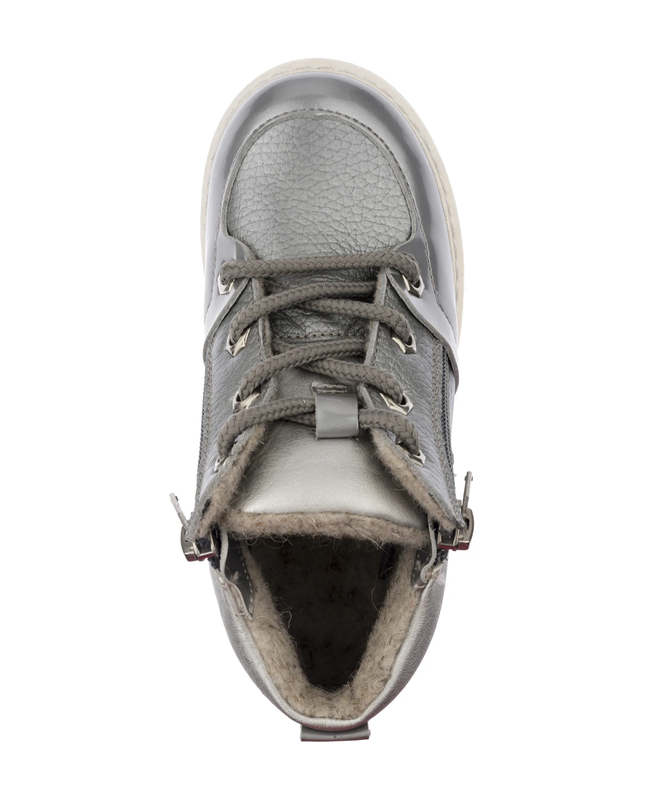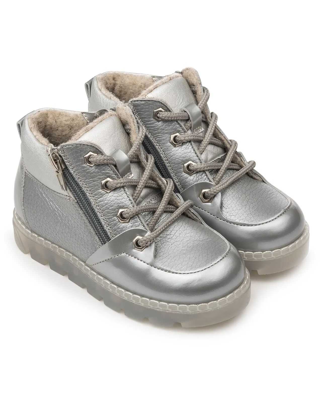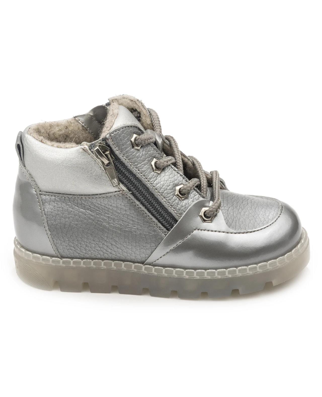 Ультрамодные серебристые осенние ботинки для девочки на подкладке из шерстяной байки. Удобная застежка на молнию с двух сторон обеспечивает лёгкое раскрытие модели и максимальный комфорт при надевании. Спереди украшены декоративной шнуровкой в тон. Подкладка из шерстяной байки поддерживает комфортную температуру внутри обуви при погодных условиях от +5 до -7 градусов. Упругая анатомическая стелька для правильного формирования стопы. Жесткий фиксирующий задник с удлиненным крылом надежно стабилизирует голеностопный сустав во время ходьбы. Упругая, умеренно-эластичная подошва с протектором, имеющая перекат, позволяющий повторить естественное движение стопы при ходьбе для правильного распределения нагрузки на опорно-двигательный аппарат ребенка. Нос усилен гидрофобной кожей.