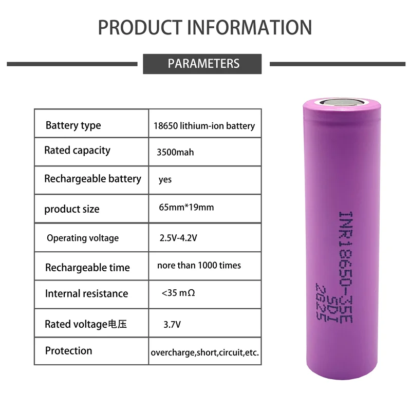 Фактическая емкость 18650-35eОписание товара:Тип батареи: INR18650-3500Номинальное напряжение: 3,7 VСтандартная емкость: 3500 мАчВнутреннее сопротивление батареи: <30 мОмМетод зарядки: 4,2 V постоянного тока постоянное напряжениеМаксимальный ток заряда: 1C (3500mA) Батарея Размер: 18,5*65,2 мм (диаметр * высота)Особенности:1. Высокая производительность, маленький размер, светильник вес.2. Напряжение разряда стабильное.3. Высокая скорость непрерывного разряда.4. Небольшое внутреннее сопротивление.5. Отсутствие загрязнения, длительный срок службы.Информация о продукте:Высококачественные литий-ионные аккумуляторы INR18650-35E* Модель: 18650* Номинальное напряжение: 3,6 V* Стандартная емкость: 3350-3550 мАч* Сделано в Корее* Максимальный устойчивый ток разряда: 20A3. Информация о ребенке:1. Стандартный ток разряда: 20AЗарядка: 1.25A, 4,20 V, CCCV 100mA отключение,Разряд: 0.2C, 2,5 V разрядный отсек2. Номинальное напряжение: 3,6 V3. Стандартная зарядка: CCCV, 1.25A, 4,20 ± 0,05 В, 100 мА отключение4. Быстрая зарядка: CCCV, 4A, 4,20 ± 0,05 В, 100 мА отключение5. Время зарядки:Стандартная зарядка: 180 мин/100 мА отключениеБыстрая зарядка: 60 мин (при 25 °C) / 100 мА отключение6. Максимальный устойчивый ток разряда: 20A (при 25 °C), 60% при 250 циклах7. Критическое разрядное напряжение: 2,5 V8. Вес ячейки: 46,0 г Макс.9. Размер ячейкиВысота: 64,85 ± 0,15 ммДиаметр: 18,33 ± 0,07 мм