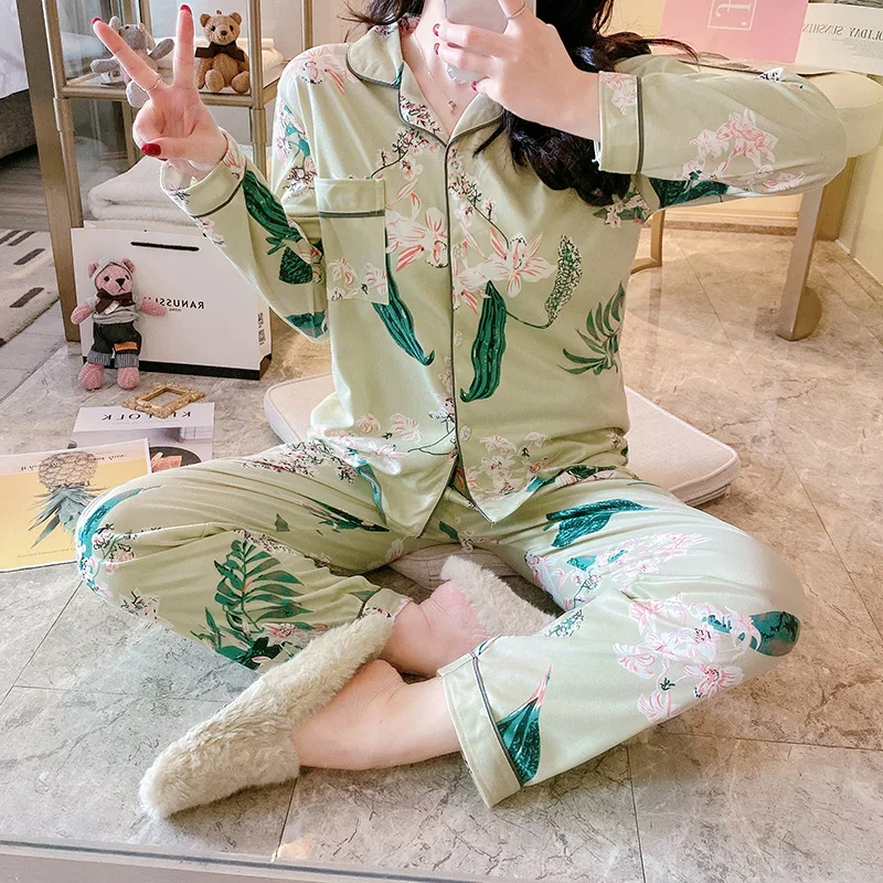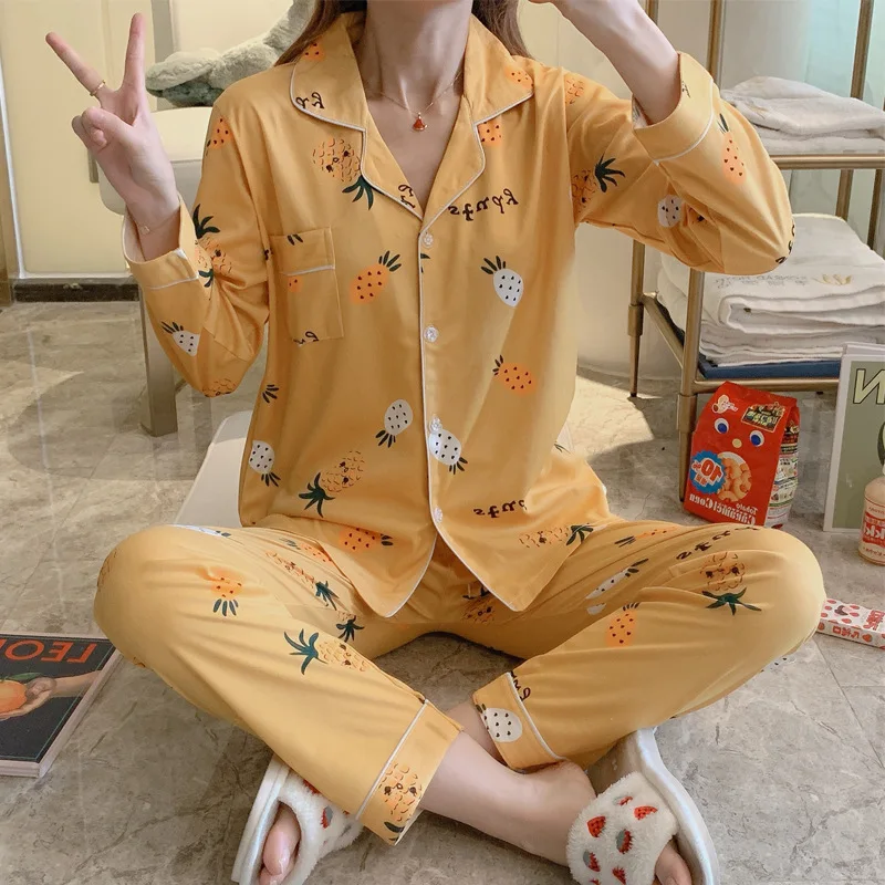 Новый женский хлопковый пижамный комплект с длинным рукавом и отложным воротником, комплект из 2 предметов, пижамные комплекты, комплекты для женщин, одежда для сна, белье для отдыха