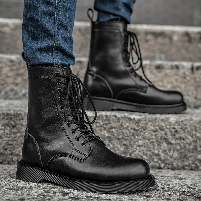 Ботинки мужские кожаные, зимние, на меху, черные, в стиле милитари