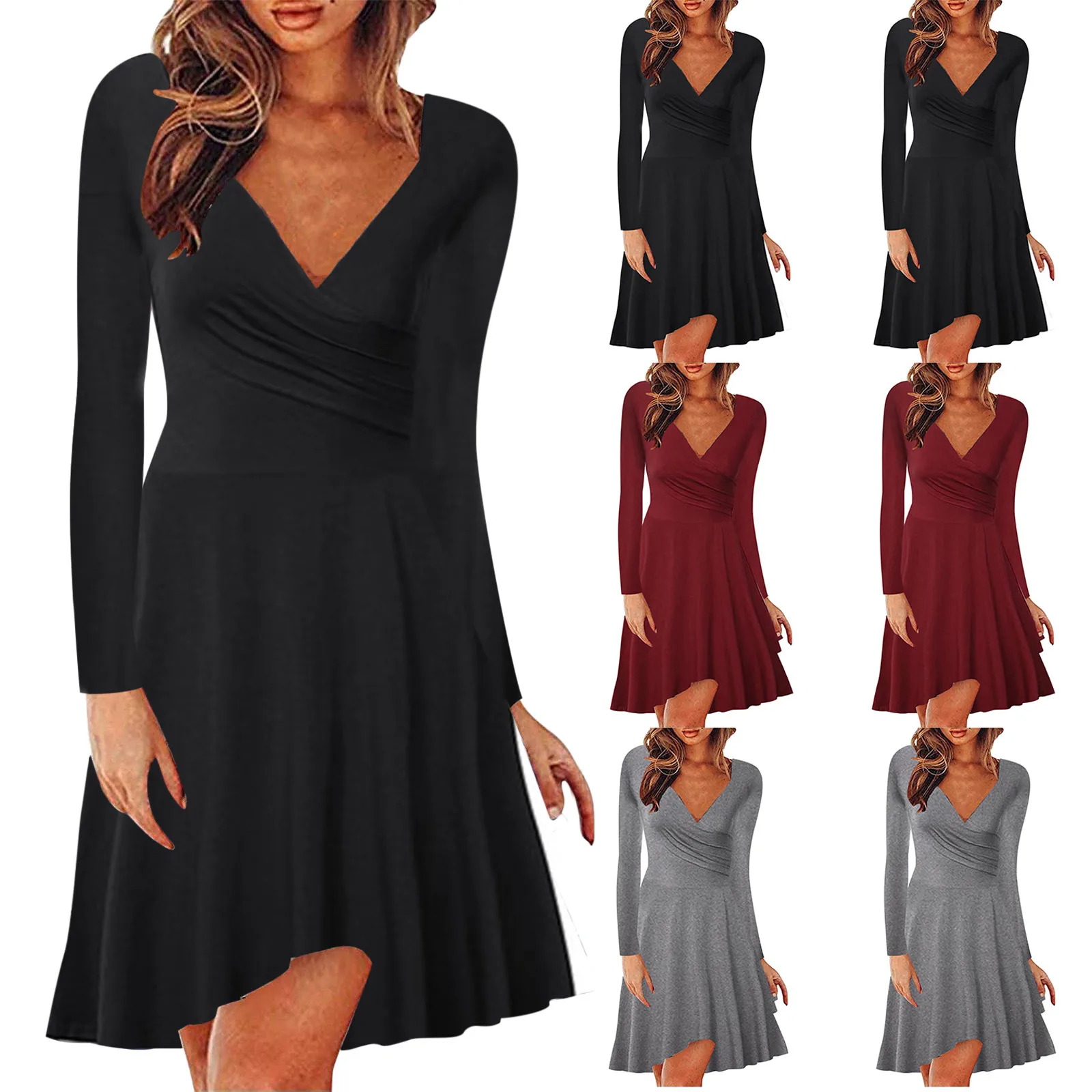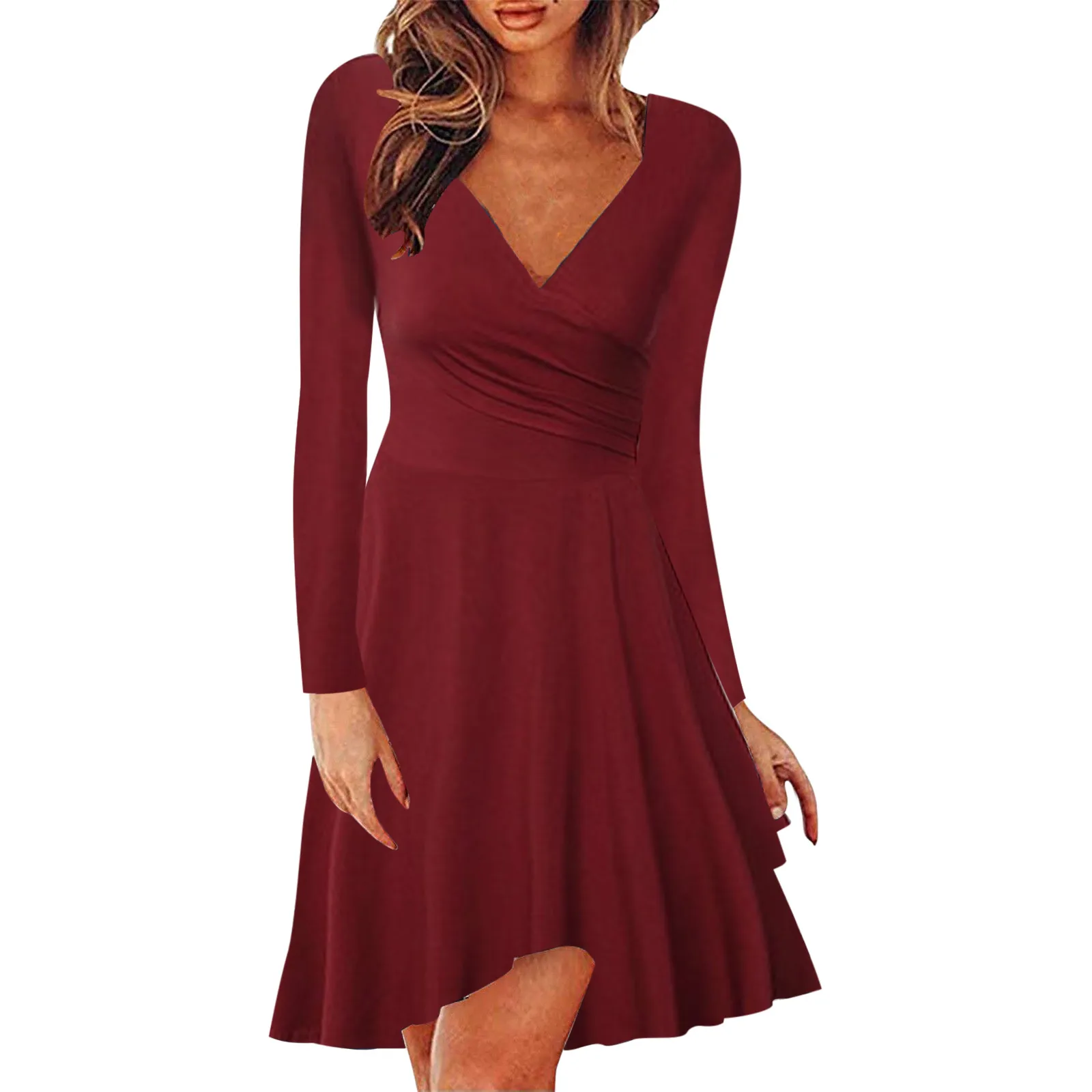 Женское платье на осень и зиму, модное Стильное однотонное платье-трапеция с длинным рукавом и V-образным вырезом, элегантное платье, вечерние платья