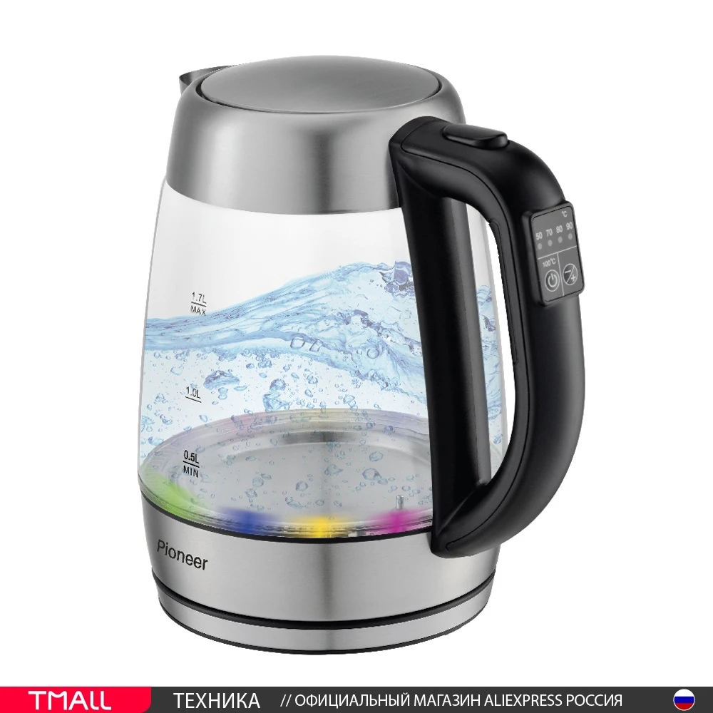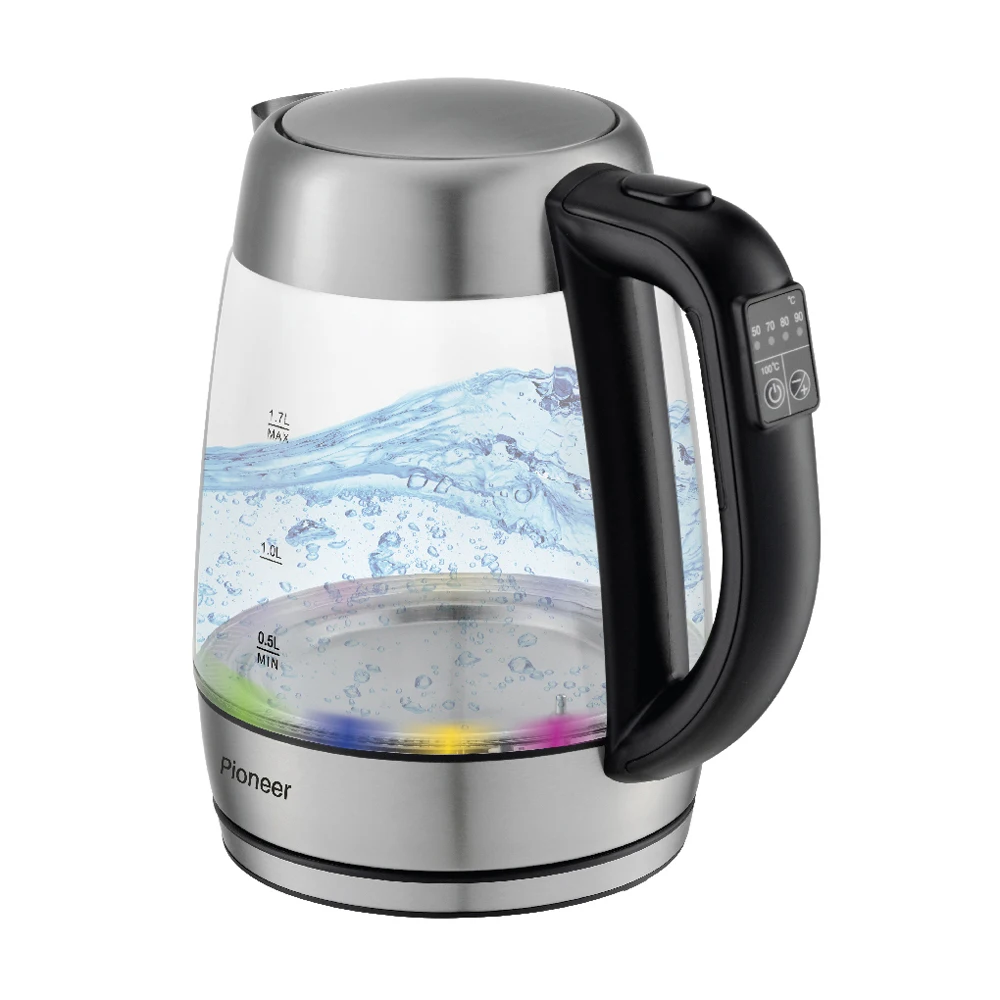 Чайник с электронным, а не механическим управлением на ручке - это что-то новое и очень интересное. Прозрачный корпус из закаленного стекла и встроенная подсветка превращают банальный процесс закипания воды в настоящее таинство, от которого глаз не оторвать. Экологичный и безопасный материал, закаленное стекло, нейтрален по отношению к воде, в нем кипятящейся. А значит, в вашем чае не будет посторонних привкусов и запахов. Встроенный датчик позволяет чайнику задействовать удобный режим поддержания температуры. Больше не надо ждать, пока вода вновь нагреется. Подсветка здесь разноцветная. Но так задумано не только ради красоты. Цвет кодирует температуру. Специальный светодиод будет загораться под соответствующим значением температуры на панели управления, а индикатор внутри будет менять цвет: 50°C – красным, 70°C – синим, 80°C – фиолетовым, 90°C – салатовым. Прочные, качественные и экологичные материалы, металл и стекло, - залог безопасности и долговечности вашего нового чайника. Управляйте всеми режимами работы чайника с помощью единого пульта управления на ручке.