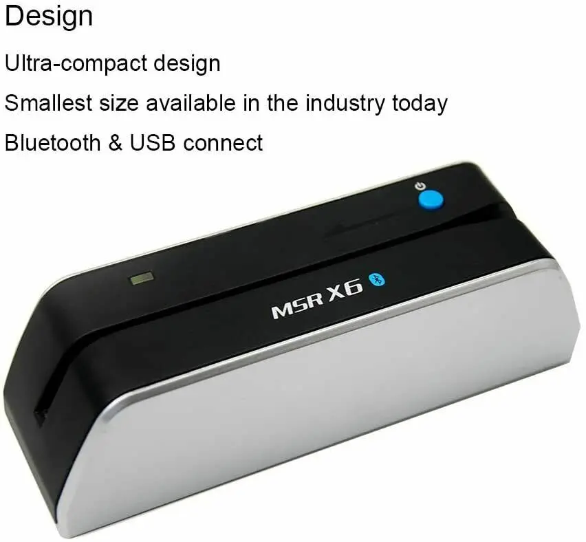Описание товараТолько в мире Bluetooth считыватель магнитных карт/и писатель!MSR X6(BT)-это самый маленький в мире считыватель/писатель магнитных карт, разработанный в США, чтобы предложить решение для чтения/Письма карт для форматов ISO 7811-6, питание от USb напрямую не требуется для дополнительного адаптера питания, он настолько мал, что легко носить с собой, удобен для перемещения или поездки.Работает со всеми основными операционными системами, такими как Windows 7, 8, Vista, Xp, 2000(32 и 64 бит) и компьютеры Apple (MacBook Air, MacBook Pro,Mac Mini,Mac Pro, iMac) и Unix,Linux даже ios,Android.Пожалуйста, обратите внимание, что старая и новая модель случайный, одна и та же функция, не влияет на использование.Особенности:1,2, 3 трека, включая кредитные карты, подарочные карты, водительские права, банкоматы и т. д.Интерфейс Bluetooth и USB работает с компьютерами и мобильными/планшетамиЗагрузите «EasyMSR» из «Google Play» или «App Store» для мобильных телефонов/планшетов Android или iPhone,iPad с помощьюБесплатное программное обеспечение для Windows 98/2000/XP/Vista/7/8(32 & 64), MAC OSHi-co & Lo-co совместимый (300 ~ 4000 OE)ISO, CA DMV, AAMVA,RAW, тип пользователяUSB интерфейс (5 футов (150 см) Длина кабеля, приблизительный)Маленький Размеры: 5,5*1,6*1,6 дюймовСветодиодный индикаторПосылка:1x MSR X6(BT) Bluetooth считыватель магнитных карт писатель кодировщик1x CD программное обеспечение1x USB кабель20x пустые HiCo магнитные карты