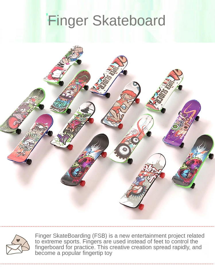 Скейтборд на пальцах кажется простым, но управлять им не так просто, как Скейтбординг. Игра на пальцевом скейтборде зависит от гибкости двух пальцев для координации и сотрудничества, используя трение поверхности доски и инерцию самого пальца, чтобы управлять им, чтобы сделать различные красивые движения. Скейтборд Finger-это новый развлекательный проект, связанный с экстремальными видами спорта. Он использует пальцы вместо двух ног управления скейтбордами для тренировки. Эта идея быстро развевается и становится популярной игрушкой с пальцами. Упаковочный лист:
