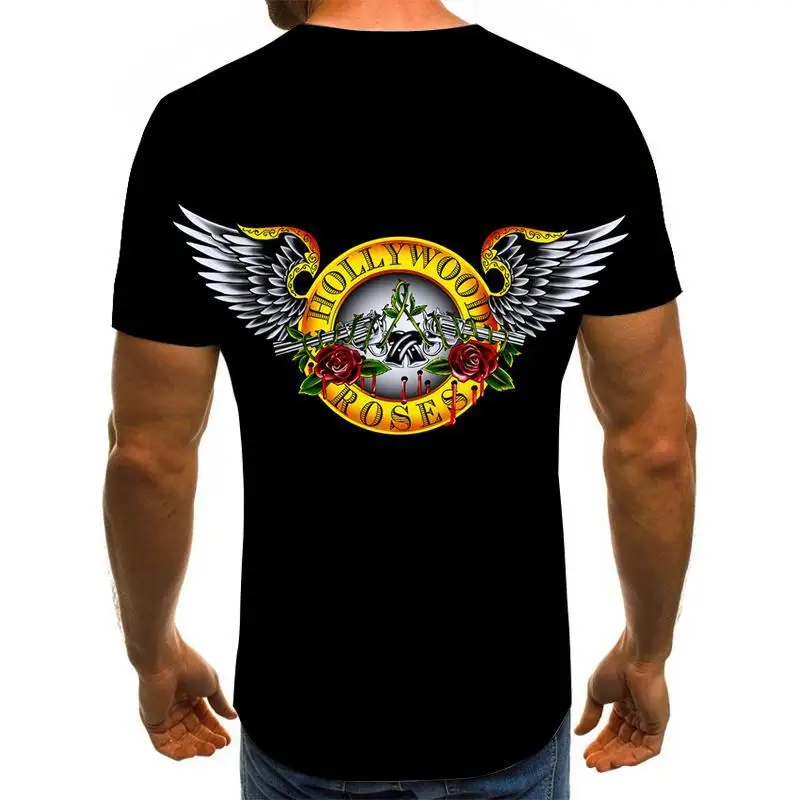 Новая модная футболка в стиле панк, Мужская черная футболка с принтом Guns N Roses, тяжелые металлические топы, платье с 3D-принтом пистолета и розы, футболки в стиле хип-хоп