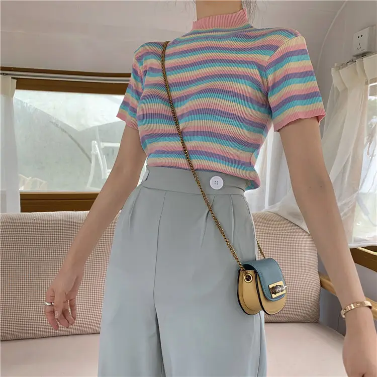 Женская Радужная футболка, тонкий трикотажный топ в полоску с коротким рукавом, женский летний топ с высокой талией, Camisetas