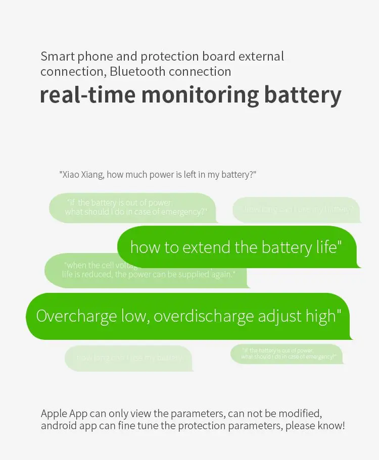 Смарт BMS Lifepo4 4S 12V 100A с Bluetooth APP является программное обеспечение, резервная плата решение разработан специально для небольших солнечной энергии аккумуляторные батареи, уличные светильники 12 В свинцово-кислотная Замена литиевых батарей и других продуктов с 4 струнами аккумуляторов. Вся система используетTI (Texas Instruments) передний чип для приобретения + MCU, И некоторые параметры могут быть гибко отрегулированы через хост-компьютер в соответствии с потребностями клиента.