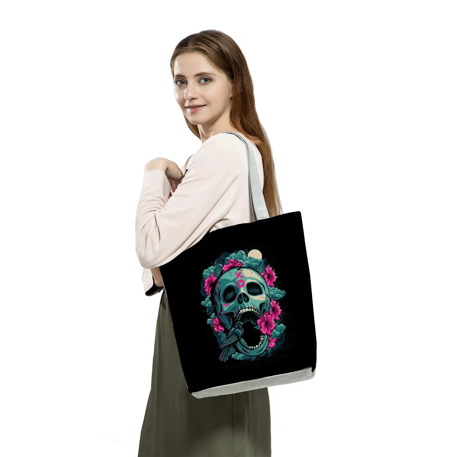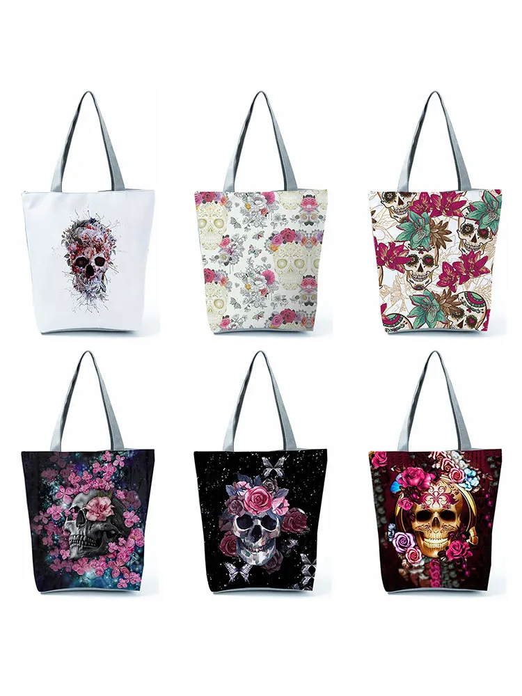 Модные Экологичные многоразовые сумки для покупок с цветочным принтом черепа на Хэллоуин, вместительная черная крутая стильная женская сумка через плечо