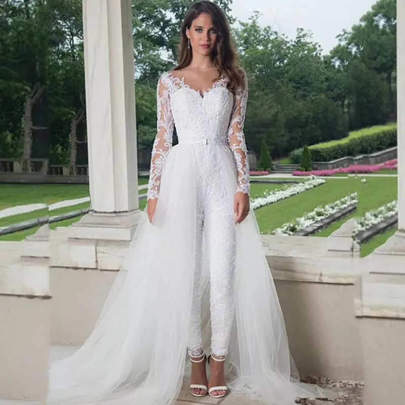 Элегантный комбинезон с V-образным вырезом, свадебное платье 2021, летний костюм 2 в 1 с длинными рукавами, кружевной аппликацией и открытой спиной со шлейфом, костюм-брюки на заказ