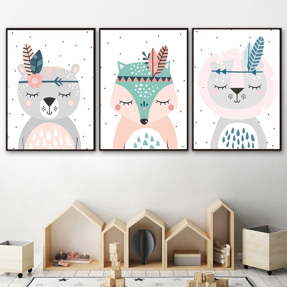 Перо Медведь Кролик лиса Лев Олень детская настенная живопись холст скандинавские постеры и принты настенные фотографии для детской комнаты декор