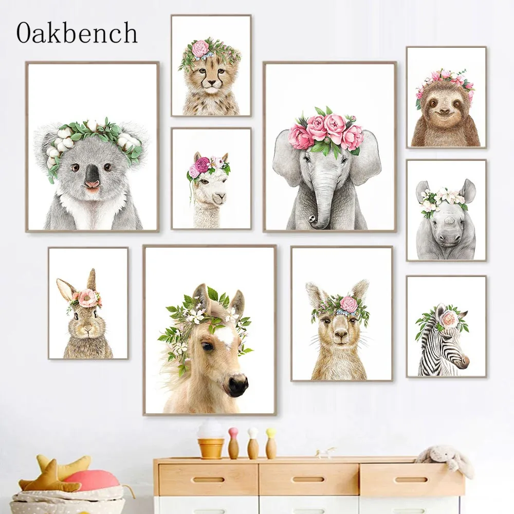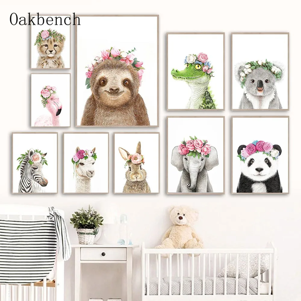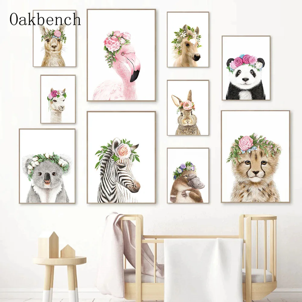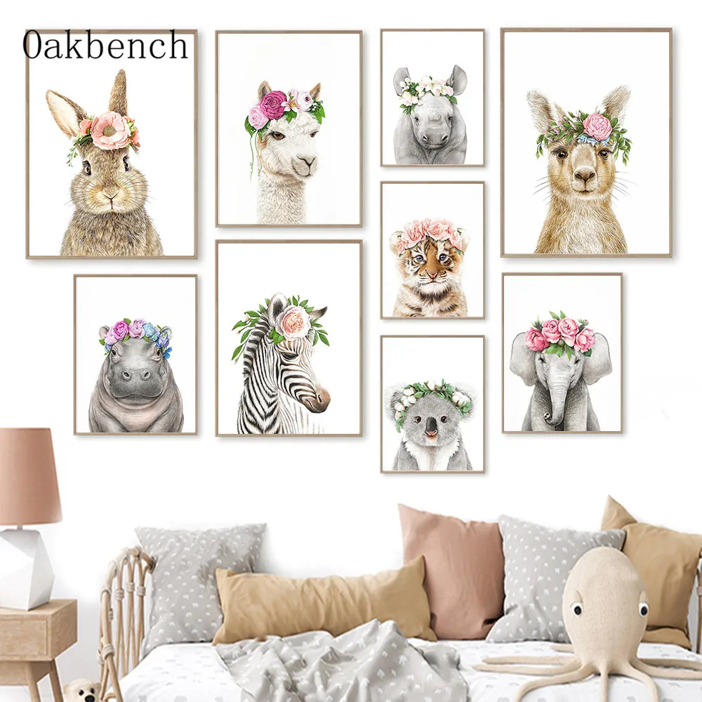 Картина с животными в лесу, слон, тигр, принт, фламинго, кролик, альпака, холст, постер, скандинавские настенные картины для декора детской комнаты