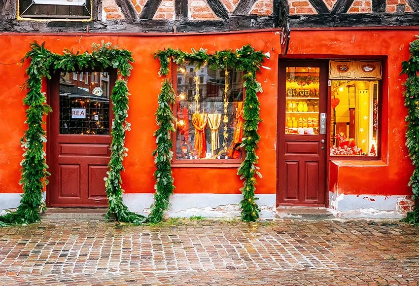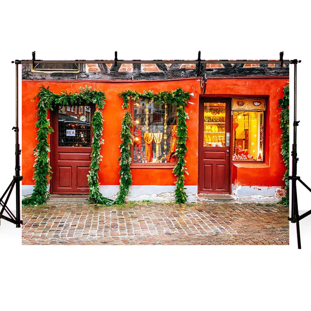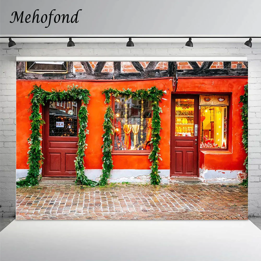 Фон Mehofond для рождественской фотосъемки, магазин аксессуаров, красная дверь, зеленые растения, кирпичный пол, портретный фон для фотостудии