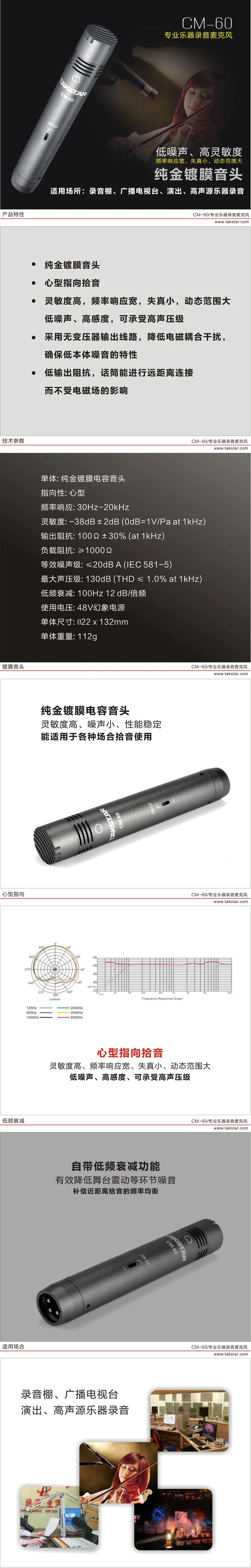 Горячая Распродажа, TAKSTAR CM-60 Профессиональный диафрагменный конденсаторный микрофон, влагостойкий XLR кардиоидный микрофон 48 В, фантомный источник питания