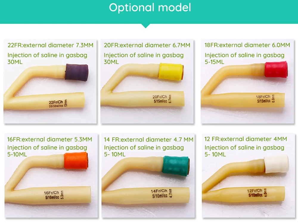 22FR: внешний диаметр 7,3 мм, инъекция солевого раствора в gasbag 30 мл20FR: внешний диаметр 6,7 мм, инъекция солевого раствора в gasbag 3OML18FR: внешний диаметр 6,0 мм, инъекция солевого раствора в gasbag 5-15 мл16FR: внешний диаметр 5,3 мм, выброс солевого раствора в gasbag 5-10 мл14 FR: внешний диаметр 4,7 мм, инъекция солевого раствора в gasbag 5-10 мл12 FR: внешний диаметр 4 мм, инъекция солевого раствора в gasbag 5-10 мл