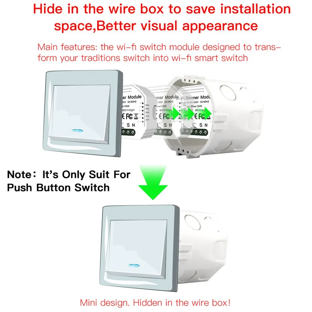 1. Легко заменить ваш традиционный переключатель диммера, чтобы сделать его умным, также вы можете сделать ваш существующий двухпозиционный переключатель умным, просто установите 1 Умный переключатель диммера «сделай сам», подходит для коробки переключателей ЕС/Великобритании, пожалуйста, подтвердите размер перед заказом.