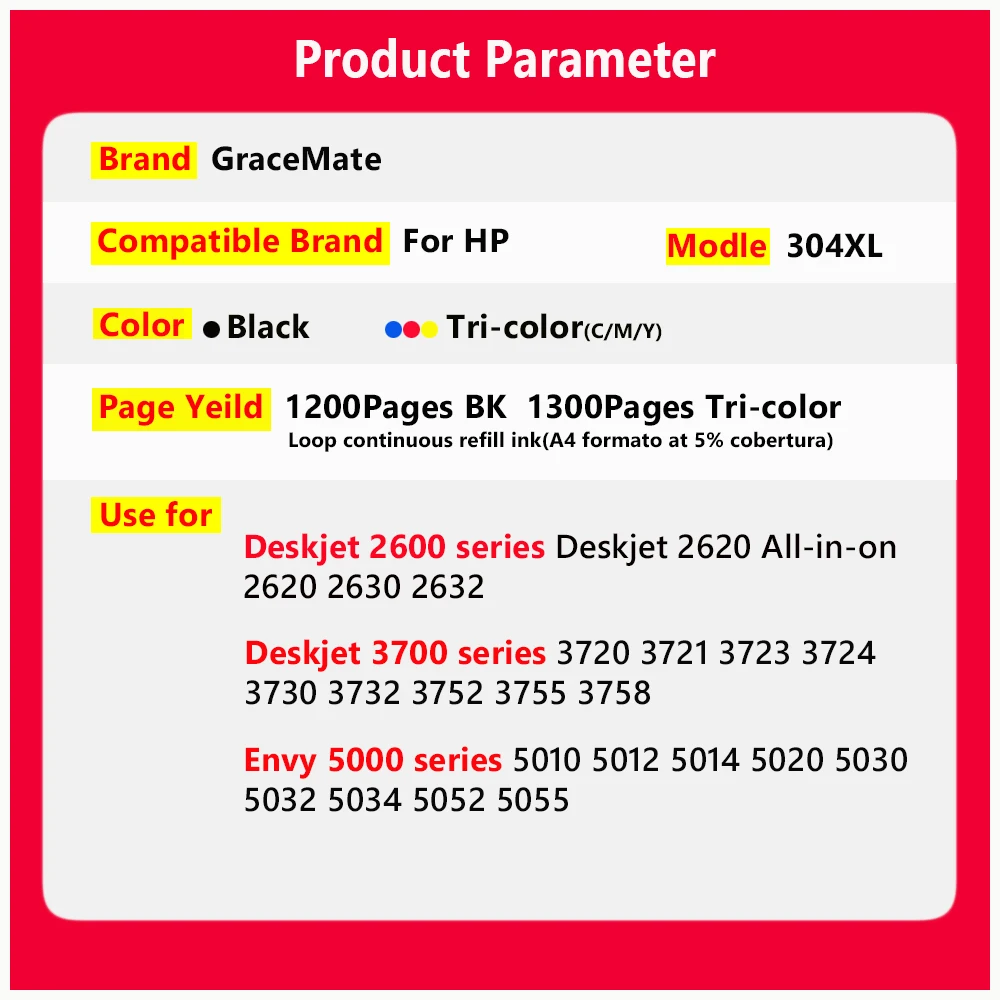 Бренд: Grace Mate Совместимый бренд: Совместим с HP Модель: 304 304XL Применимые модели: Серия HP Envy 5000. Серия Deskjet 2600.HP Deskjet 3700 серии 3720 3721 3723 3724 3730 3732 3752 3755 3758HP с чернилами HP Deskjet 2600 серии HP с чернилами HP Deskjet 2620 все-в-на 2620 2630 2632HP Deskjet 3700 серии 3720 3721 3723 3724 3730 3732 3752 3755 3758HP Envy 5000 серии 5010 5012 5014 5020 5030 5032 5034 5052 5055 Страница Yelid: Петля непрерывного пополнения чернил, 2500 страница Примечание: Модели чернильных картриджей отличаются для разных областей, хотя модель принтера одинаковая! Подтвердите модель принтера перед покупкой. Если вы не можете подтвердить модель принтера или подходящую модель чернильного картриджа, пожалуйста, свяжитесь с нами.