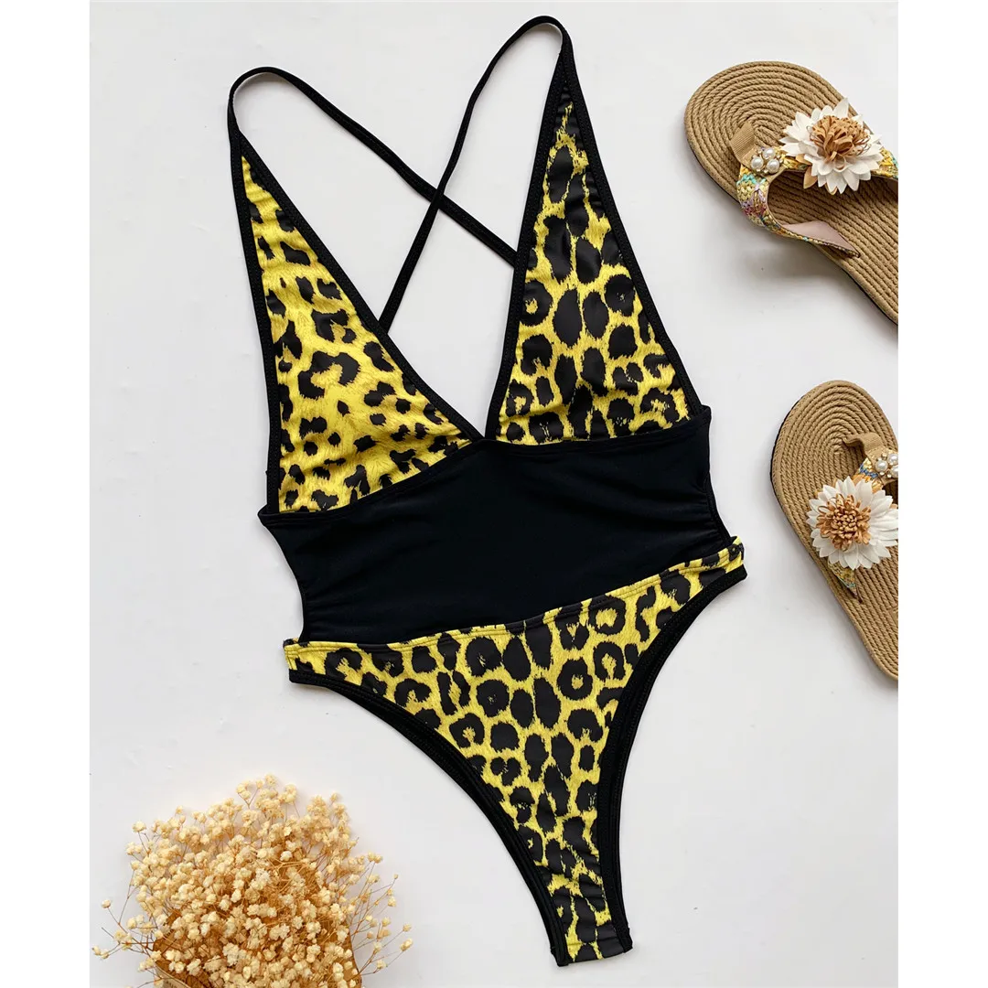 Сексуальный цельный купальник с глубоким v-образным вырезом и леопардовым принтом, женская одежда для плавания, Женский монокини с открытой спиной, купальный костюм V3145