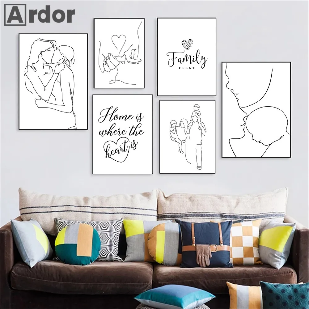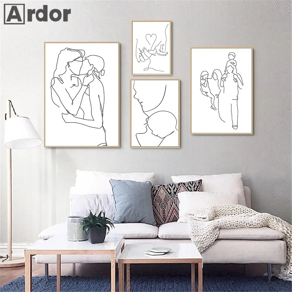 Семейный портрет, принт, Папа, мама, ребенок, линия, настенный художественный постер на холсте, картина сына, дочь, любовь, ручной поцелуй, настенные картины, декор для спальни