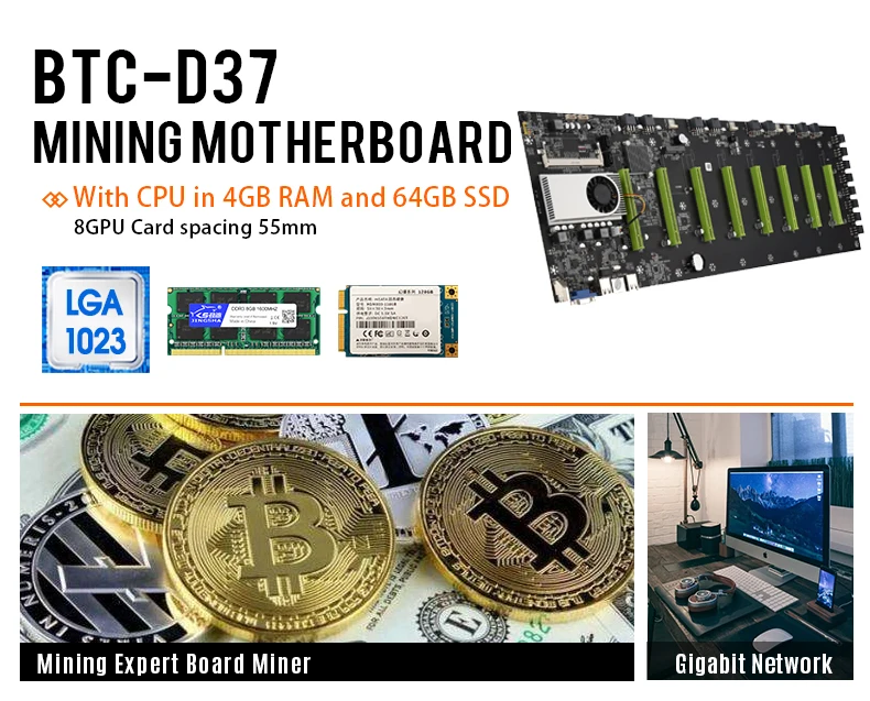 1 * D37 Mining mматеринская плата, 1*128 ГБ SATA SSD, 1*8 ГБ DDR3 1600 МГц RAM,
