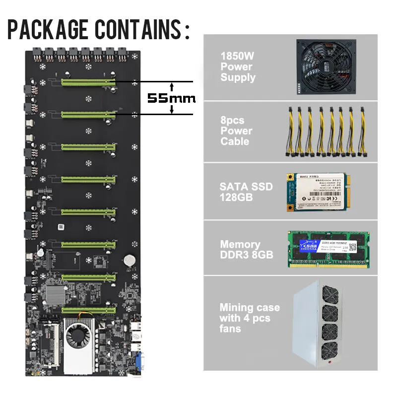 Набор материнской платы для майнинга, 8 GPU, Биткоин, криптоэфириум, Биткоин, низкая мощность, с 8 Гб ОЗУ, mSATA SSD, кабель питания, чехол для майнинга