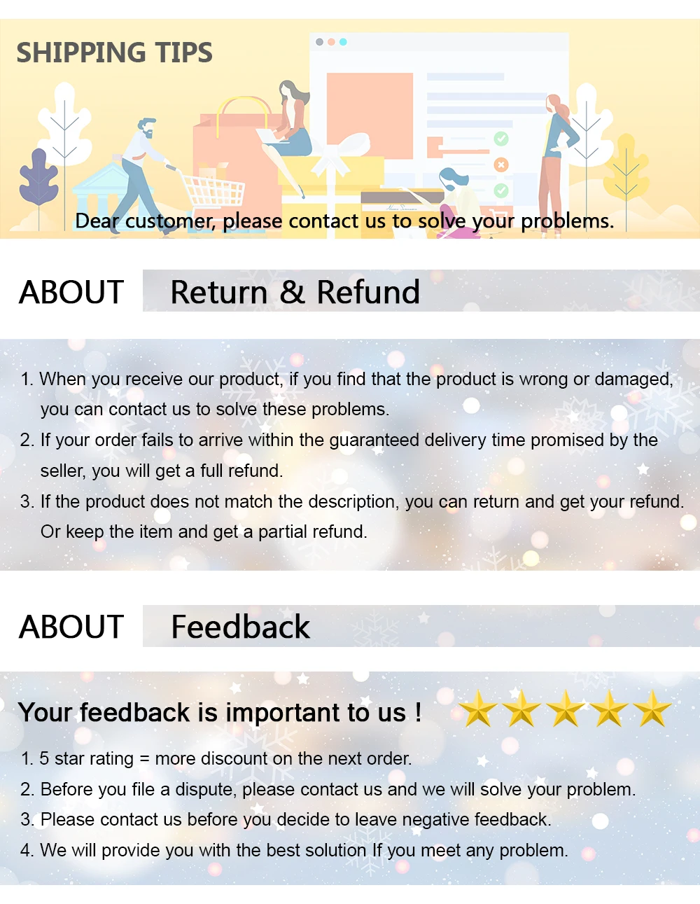 1. Если есть какие-либо вопросы о нашем продукте или обслуживании: Пожалуйста, обязательно свяжитесь с нашим персоналом по обслуживанию клиентов, мы очень рады Вам помочь. Мы приложим все усилия, чтобы найти лучшее решение, пока вы не будете удовлетворены. Пожалуйста, не ставьте нам плохую оценку, которая не поможет решить проблему. 2. Если вы удовлетворены нашими продуктами и услугами, пожалуйста, оставьте 5 звезд. Спасибо за вашу поддержку.