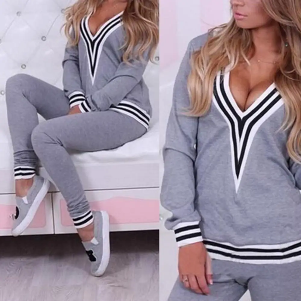 80%, новинка, 2 шт.компл., Женский Повседневный хлопковый спортивный костюм с V-образным вырезом и полосками на подоле