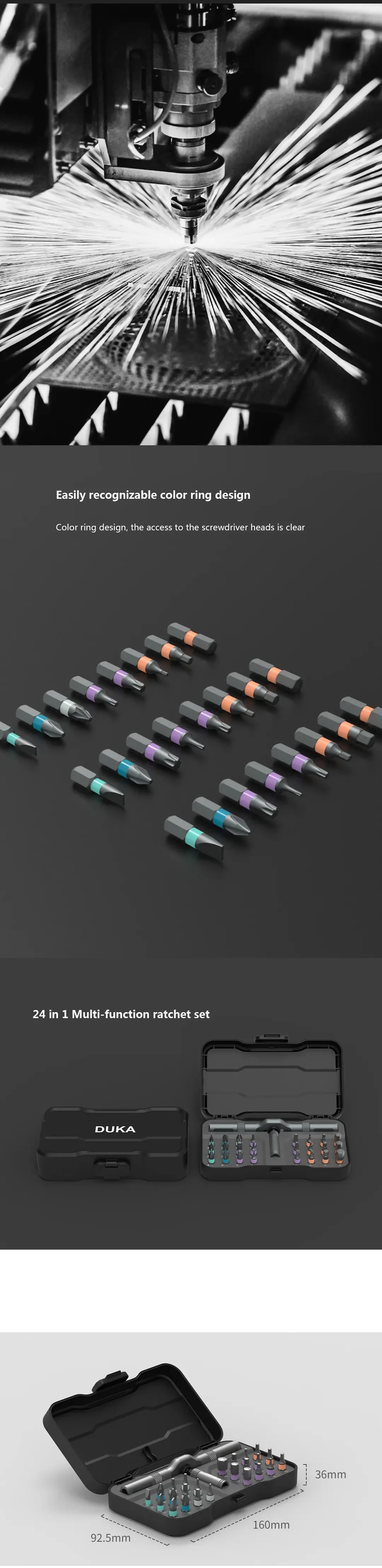 Высокоточное интегрированное формование с ЧПУ, карбюрирование термической переработки, срок службы промышленного класса, жесткий, но не хрупкий, полный прочности.* 5 категорий головок отверток, удовлетворяют потребности профессионального использования, домашней жизни, работы, DIY, технического обслуживания.* 6,2 градусов ratchet труда • Большой энергосберегающий ЖК-дисплей, 58 зуб положительный и отрицательный поворот ratchet структура, за исключением 80% усилие* Можно использовать бытовую мебель-Храповик* Домашняя техника для верховой езды-можно использовать храповую деформацию* DIY разборка-используйте отвертку* Ковка прессованный Супер жесткий алюминиевый сплав, обычная сталь прочность, 1/2 легкий вес* Комфортные ощущения, долго не устают* Легко узнаваемый дизайн цветного кольца, доступ к головкам отвертки ясенПосылка включает в себя:1 Набор отверток с трещоткой DUKA 24 в 1