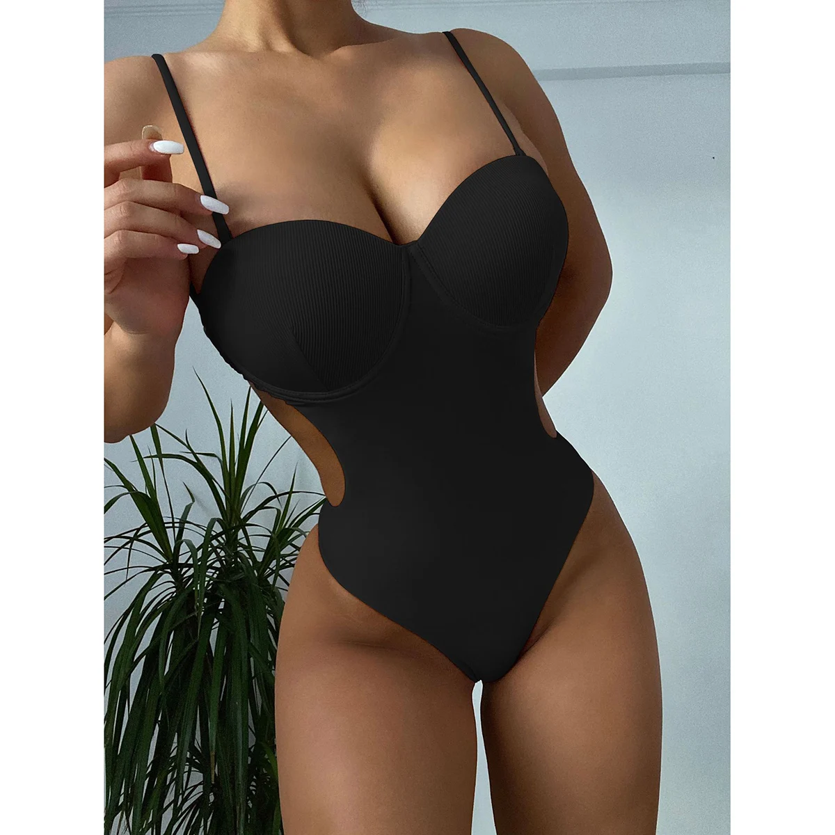 2021 сексуальный цельный купальник женский однотонный черный стринг...