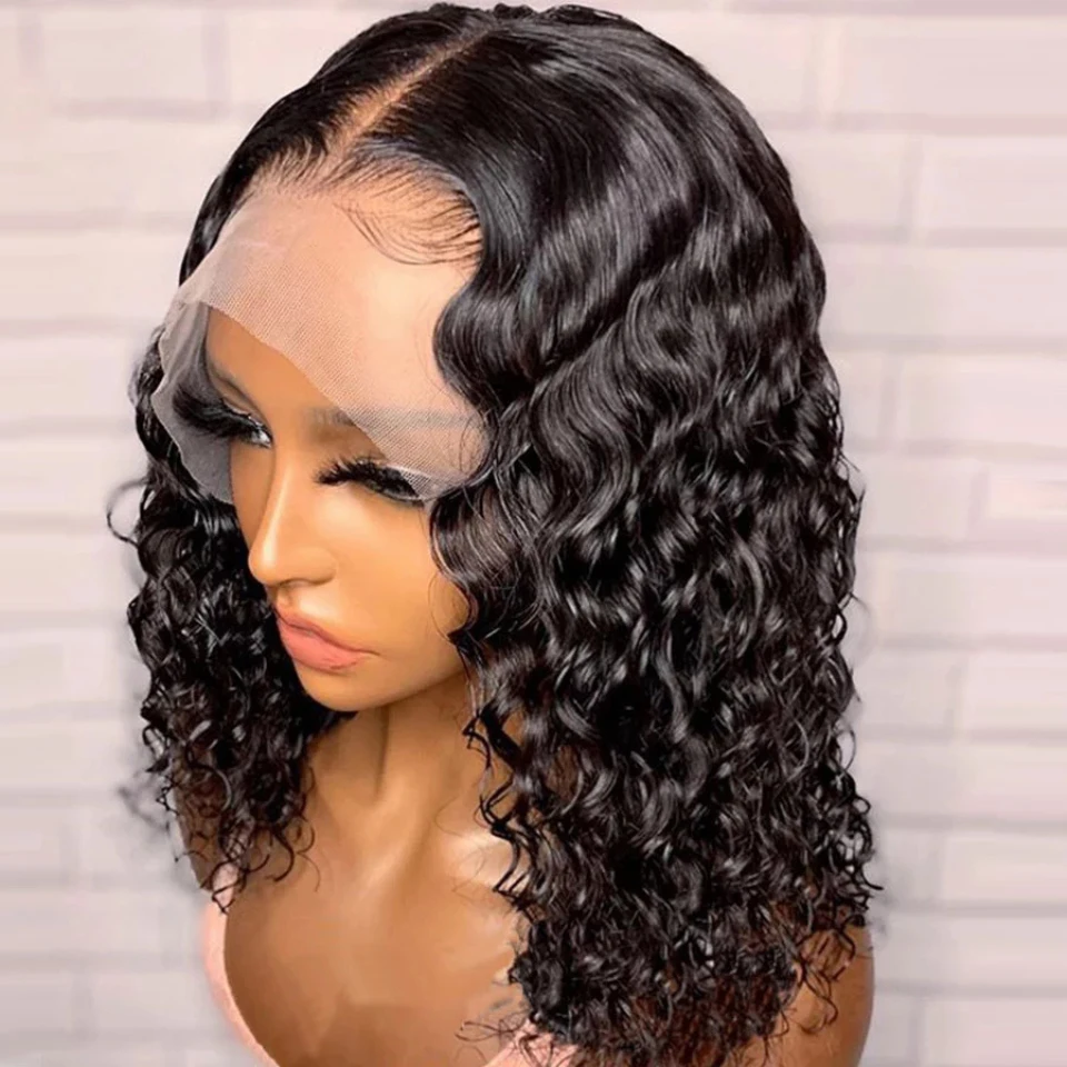 Парик струйный Черный из синтетических волос, фронтальная сетка, волнистые, с детскими волосами, короткие, с волнистыми кружевами, с предварительно выщипанными