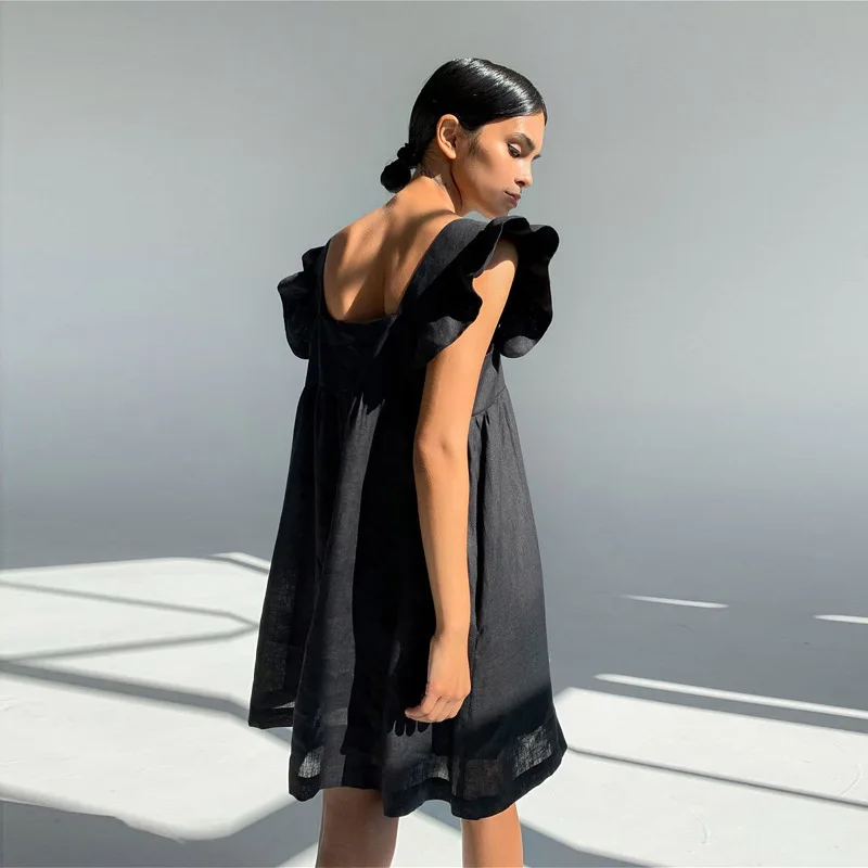Повседневное милое мини-платье с квадратным вырезом и рукавом-бабочкой, женское свободное льняное однотонное платье с открытой спиной и высокой талией, лето 2021