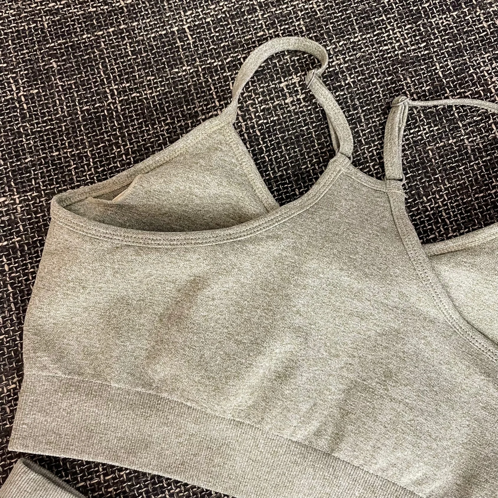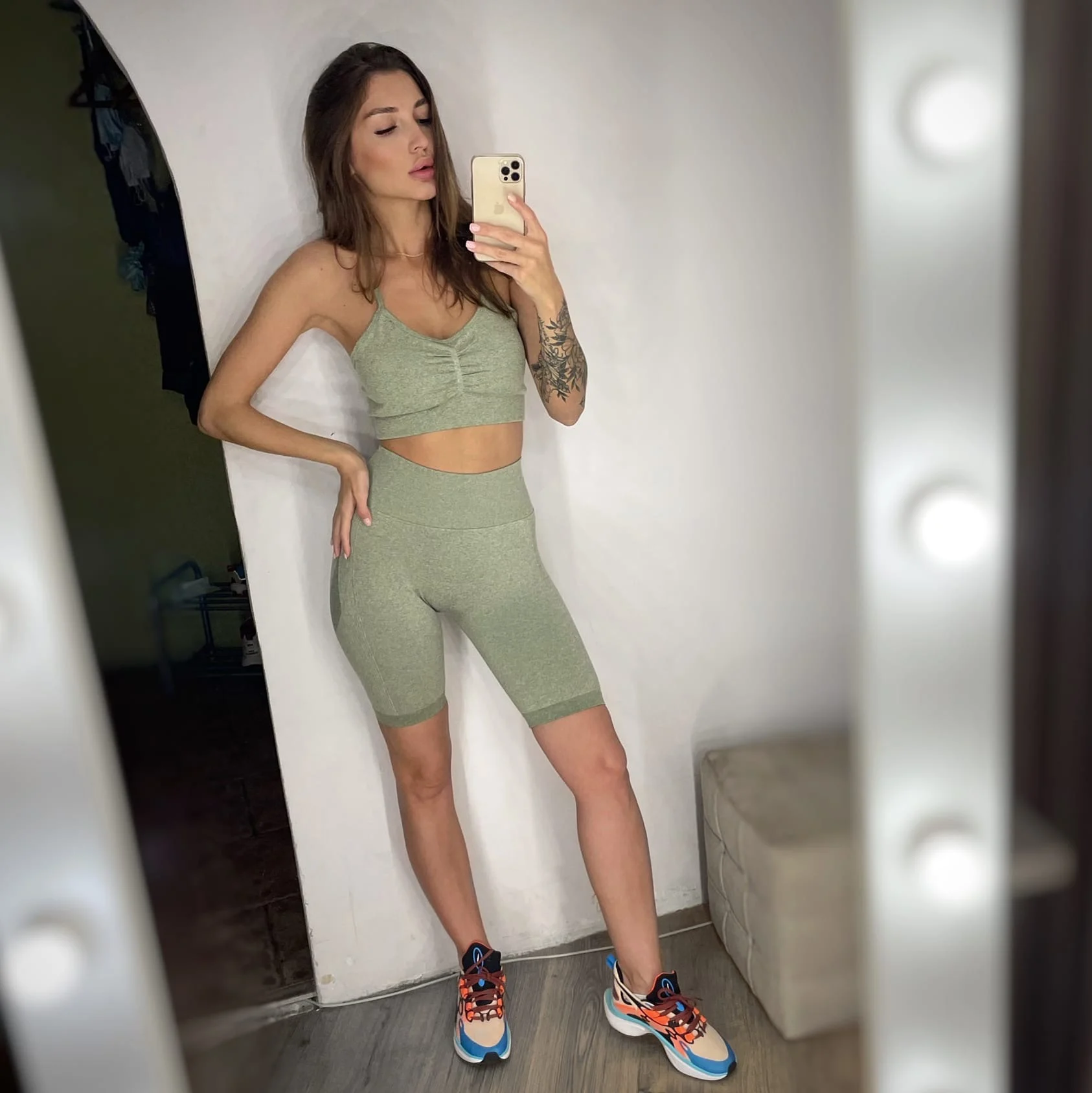 брала сразу комплект. доставка быстрая, не больше 2х недель. леггинсы с высокой посадкой. материал плотный и эластичный, но тянется не очень сильно, благодаря этому создаёт ещё и утягивающий эффект. при занятиях леггинсы не светят, можно носить любое белье. на ОБ 94 см и рост 166 см подошел размер М
