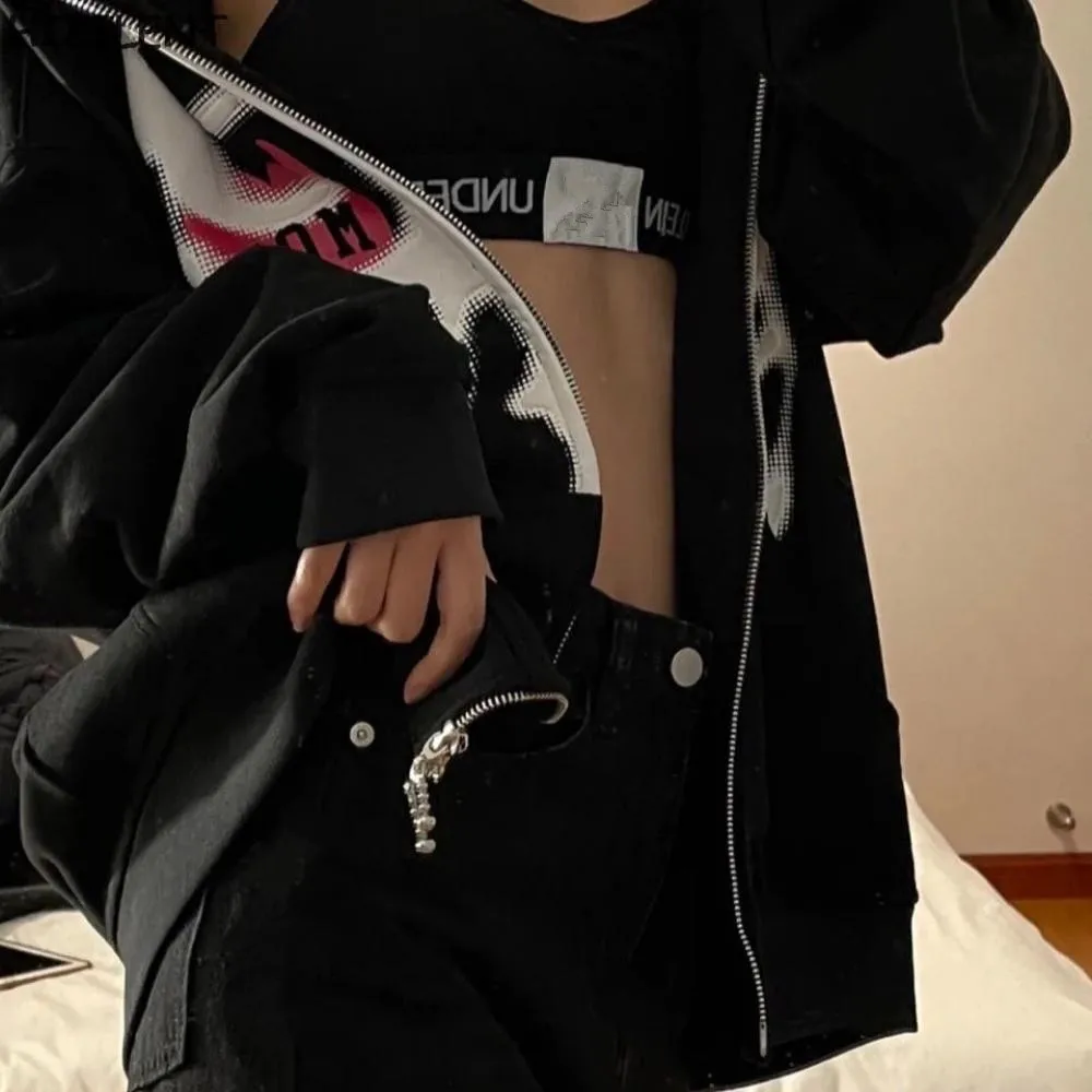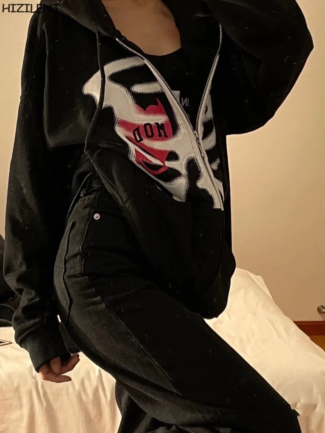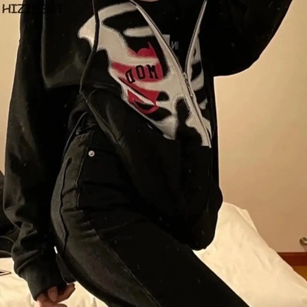 Свободная куртка Y2K в Корейском стиле Харадзюку с принтом черепа в готическом стиле гранж с длинными рукавами пальто с капюшоном Ретро рубашка для студентов топы для E-girl толстовка на молнии